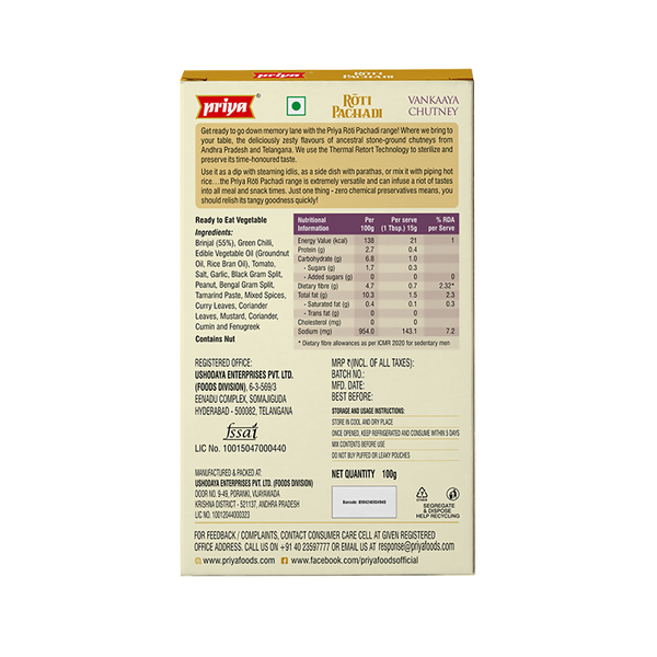• Take your taste buds on a nostalgic journey with the rich and delectable taste of Vankaaya Chutney that you know and love in a Roti Pachadi for generations to come. Infused with mixed spices and packed using our Thermal Retort Technology to preserve its time-honoured flavours, is a perfect lip-smacking accompaniment for a meal or a snack.
