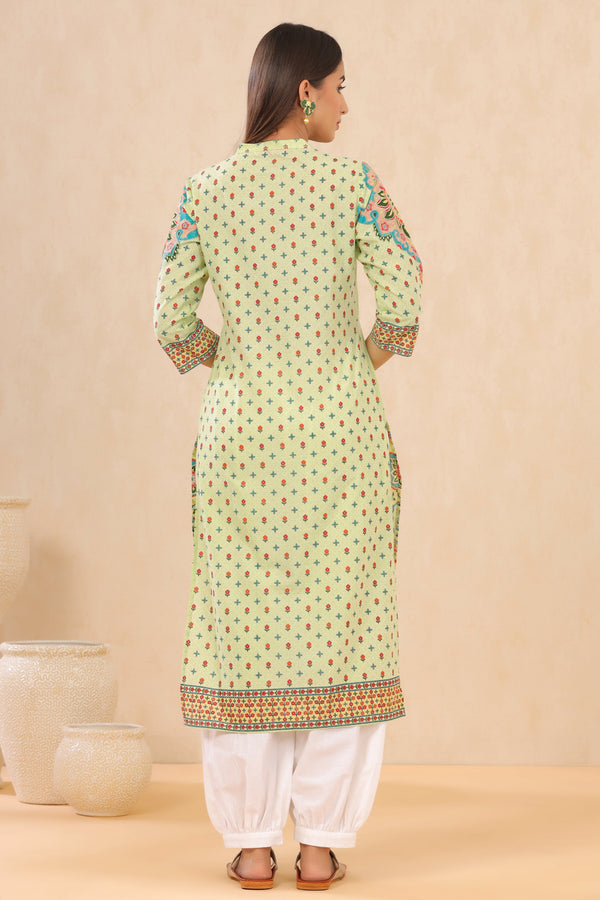 Pista Green Ethnic Motif Printed Pure Cotton Kurta. Featuring A Mandarin Collar And Three-Quarter Regular Sleeves. Designed For Slip-On Ease With Side Slits, Ideal For Daily Wear.