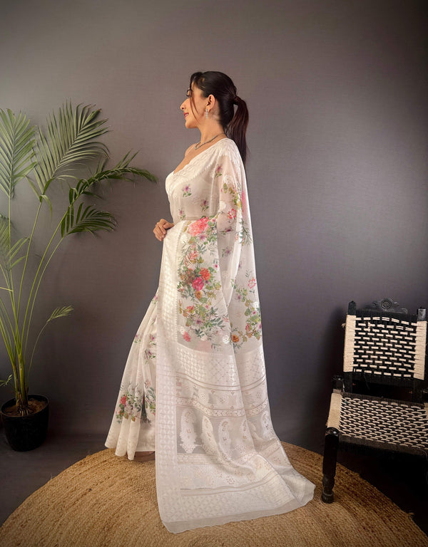 Sonakshi Women's White Blend Silk Jacquard Woven Traditional Saree with Blouse