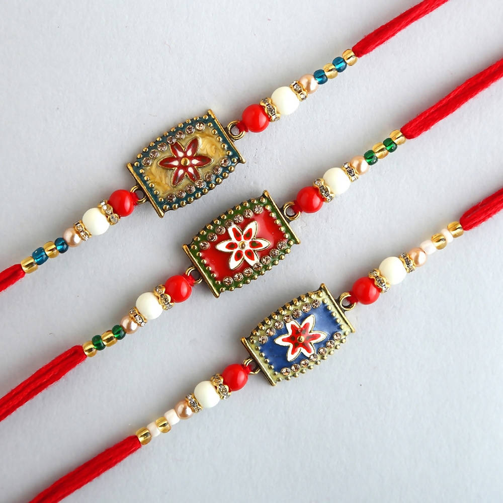 Set of 3 Meenakari Rakhi With Dry Fruits & Gulab Jamun Combo:Product Details: Designer Meenakari Rakhi- Set of 3 These ethnic rakhis showcase m...
