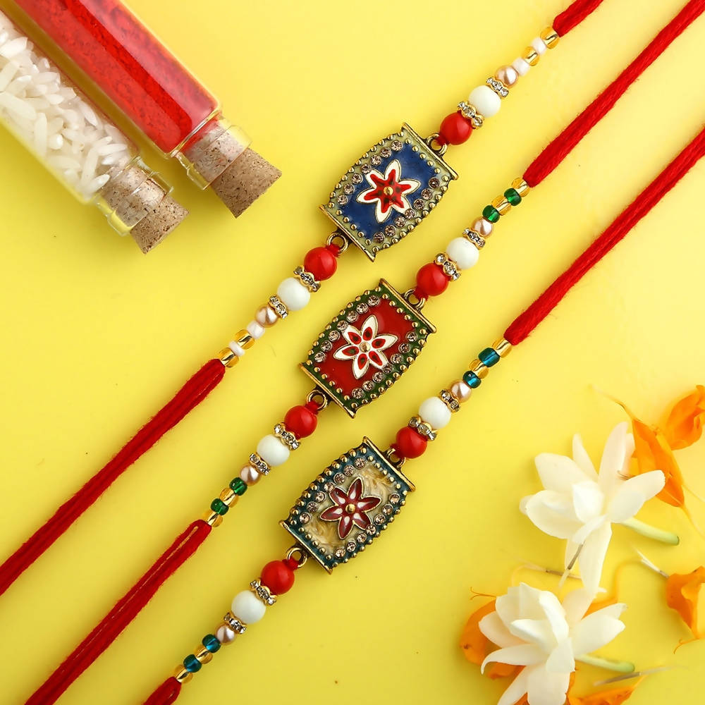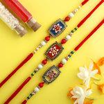 Set of 3 Meenakari Rakhi With Dry Fruits & Gulab Jamun Combo: