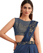 Navy Blue Satin Embroidered Ready To Wear Saree With Unstitched Blouse Piece - Nandika - Free Size