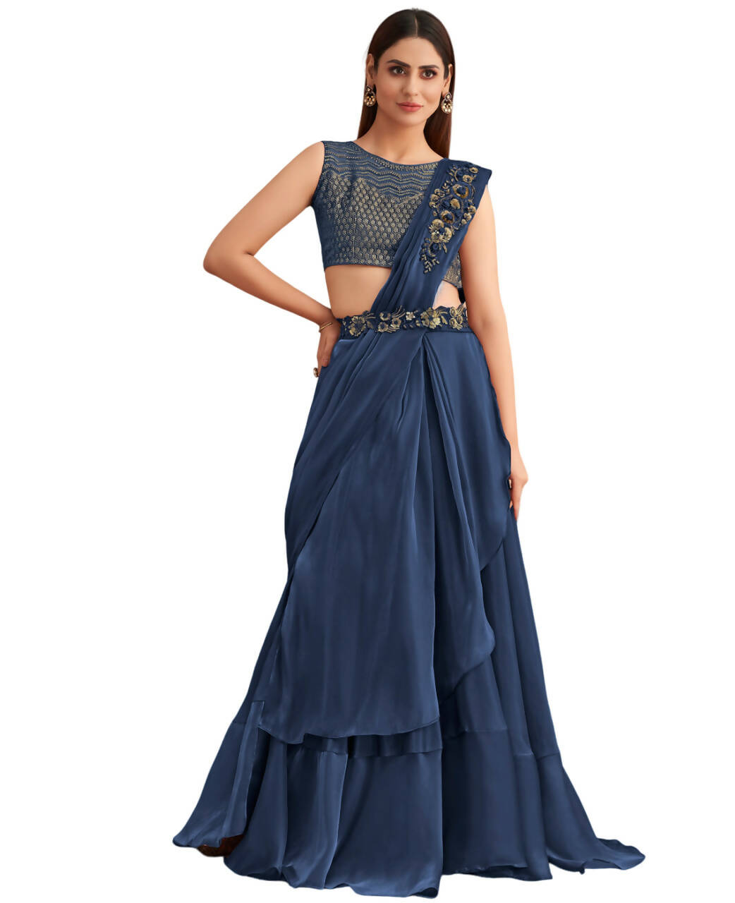 Navy Blue Satin Embroidered Ready To Wear Saree With Unstitched Blouse Piece - Nandika About the product: This colored stitched saree is made from...