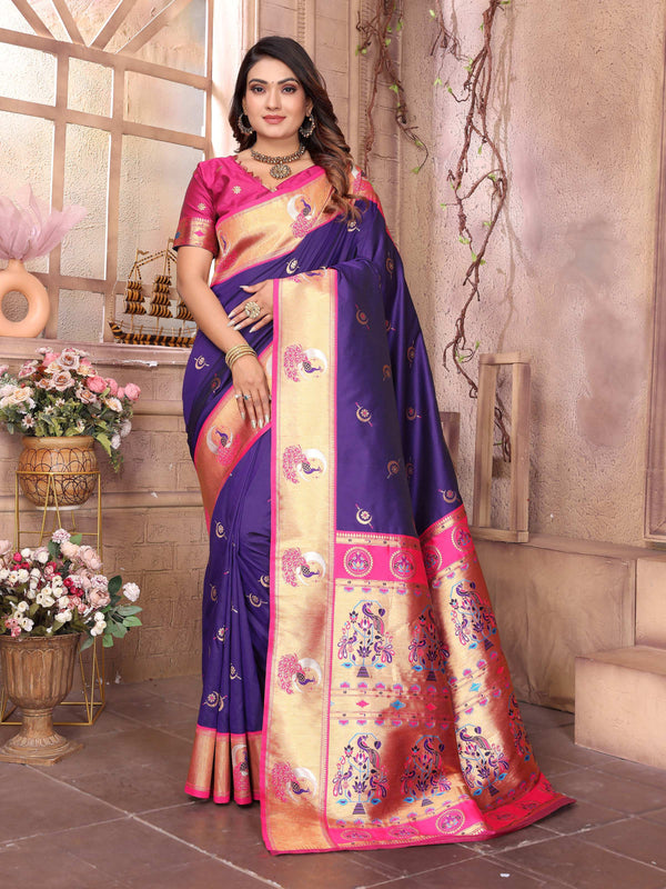 Sonakshi Women's Blue Paithani Silk Zari Woven Traditional Saree with Blouse