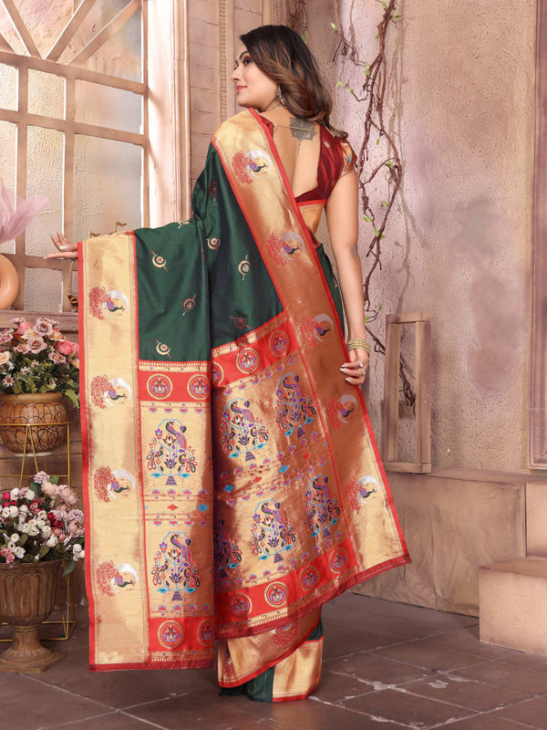 Sonakshi Women's Bottle Green Paithani Silk Zari Woven Traditional Saree with Blouse - Free Size