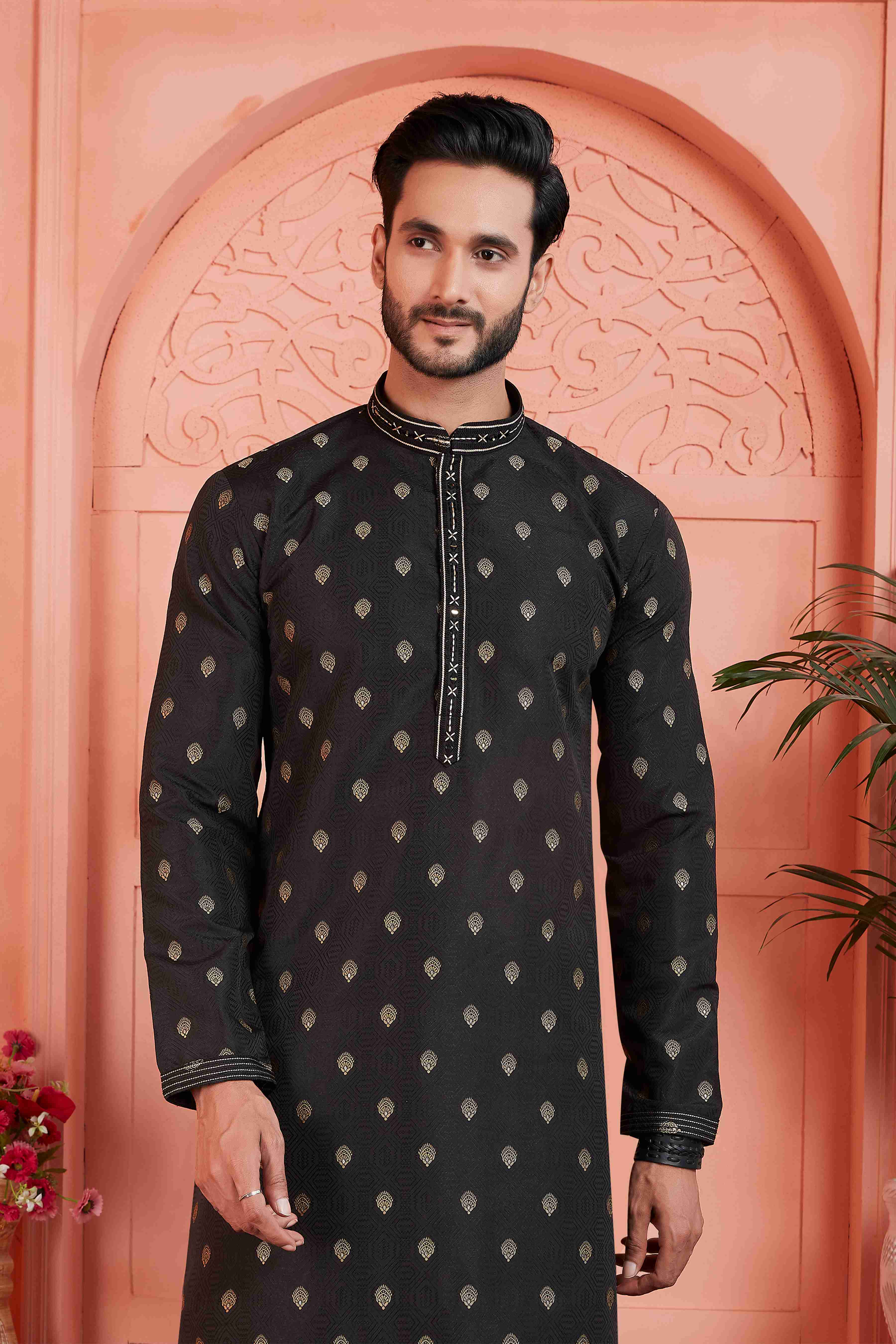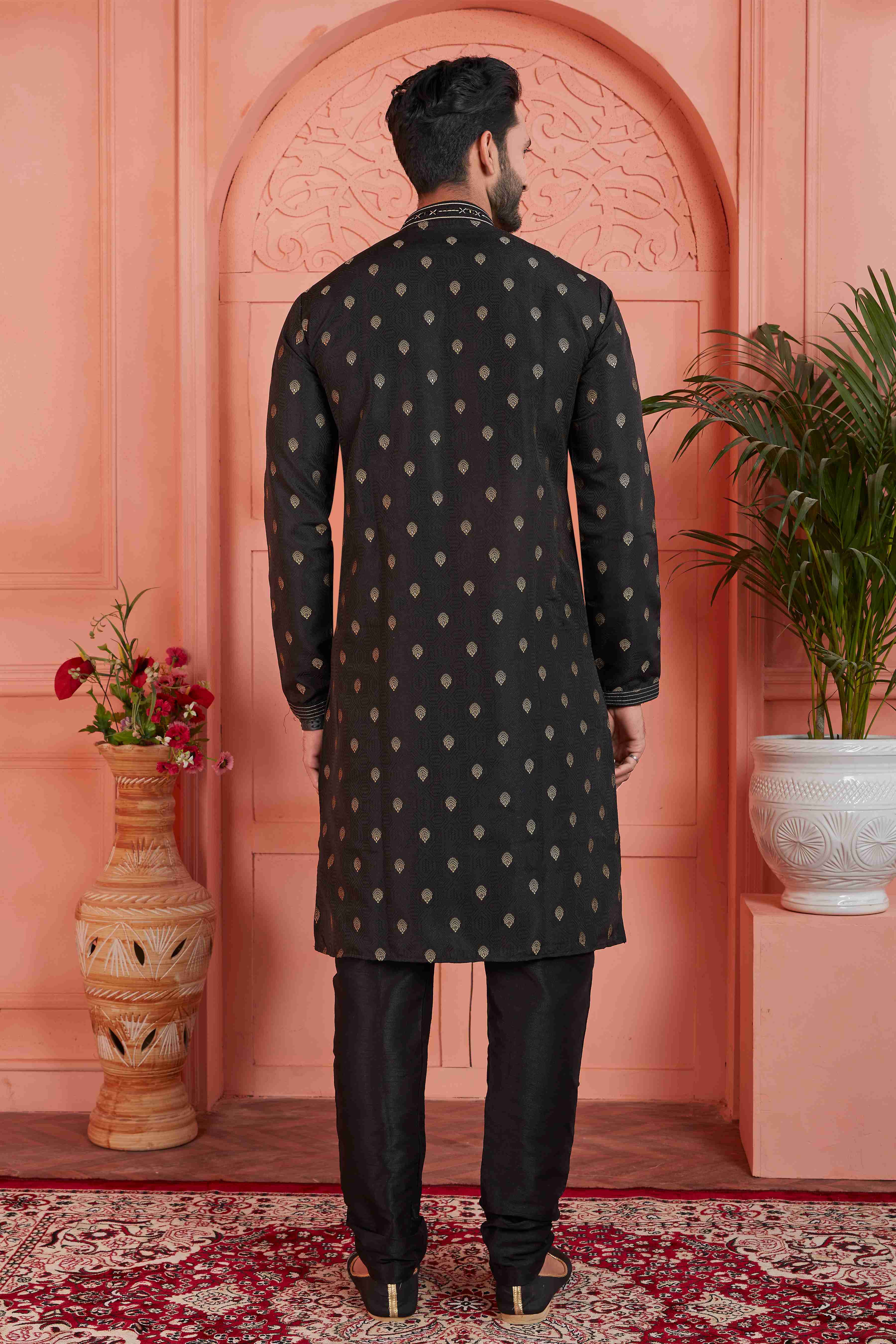 Raivat Ethnic Jacquard Silk Brocade Pintux Work Kurta Pyjama In Black ColourAbout The productEnhance your traditional wardrobe with this stylish ku...