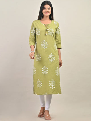 Swasti Women Green Ethnic Motifs Printed Floral Kurta Product Details Colour: green Ethnic motifs printed Round neck Three-quarter, regular sleeves Straight shape with regular style Zari detail Knee length with straight hem Machine weave regular cotton Size & Fit The model (height 5'8) is wearing a size S Material & Care CottonDry in shade::Hand wash Specifications Sleeve Length: Three-Quarter Sleeves Shape: Straight Neck: Round Neck Print or Pattern Type: Ethnic Motifs Design Styling: Regular Slit Detail: Side Slits Ornamentation: Zari Length: Knee Length Hemline: Straight Colour Family: Earthy Weave Pattern: Regular Weave Type: Machine Weave Occasion: Festive Complete The Look Disclaimer There might be minor color variation in terms of print, between actual product and image shown on screen due to lighting on the photography. Legal Disclaimer: Product colour may slightly vary due to photographic lighting sources or your monitor settings.