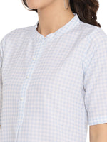 • A Blue and white checked tunic with a front pleat, has a mandarin collar, short sleeves, and mock button closure