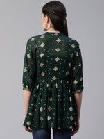 This Georgette jacket-type tunic is made by Ahalyaa. It looks like Gujarati kediya that people often wear on Navratri night for playing Garba. this tunic has broad lace in the front for great detailing of the tunic. Tunic has malai Dori for tie-up in front. Pair it with light color jeggings and gold kohlapuris for that perfect ethnic look. You can wear this tunic casually or even at a party.