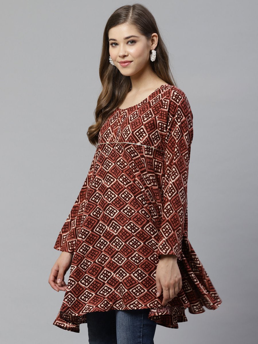 Ahalyaa Maroon & Beige Ethnic Printed Asymmetric Tunic