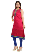 Make ‘comfort’ your summertime motto by choosing this Bold and Blast Hot Pink Raw Silk Sleeveless Tunic for Everyday Comfort Wear, a unique piece by Snehal Creation. Crafted to have a round neck sans any sleeves, this one is the perfect piece for those sunny days out. Blue-colored taping around the neck followed by a brown patch as the neck panel decorates it beautifully and the A-line silhouette makes you appear leaner. Team it up with a churidar of any contrast color and you are good to go.