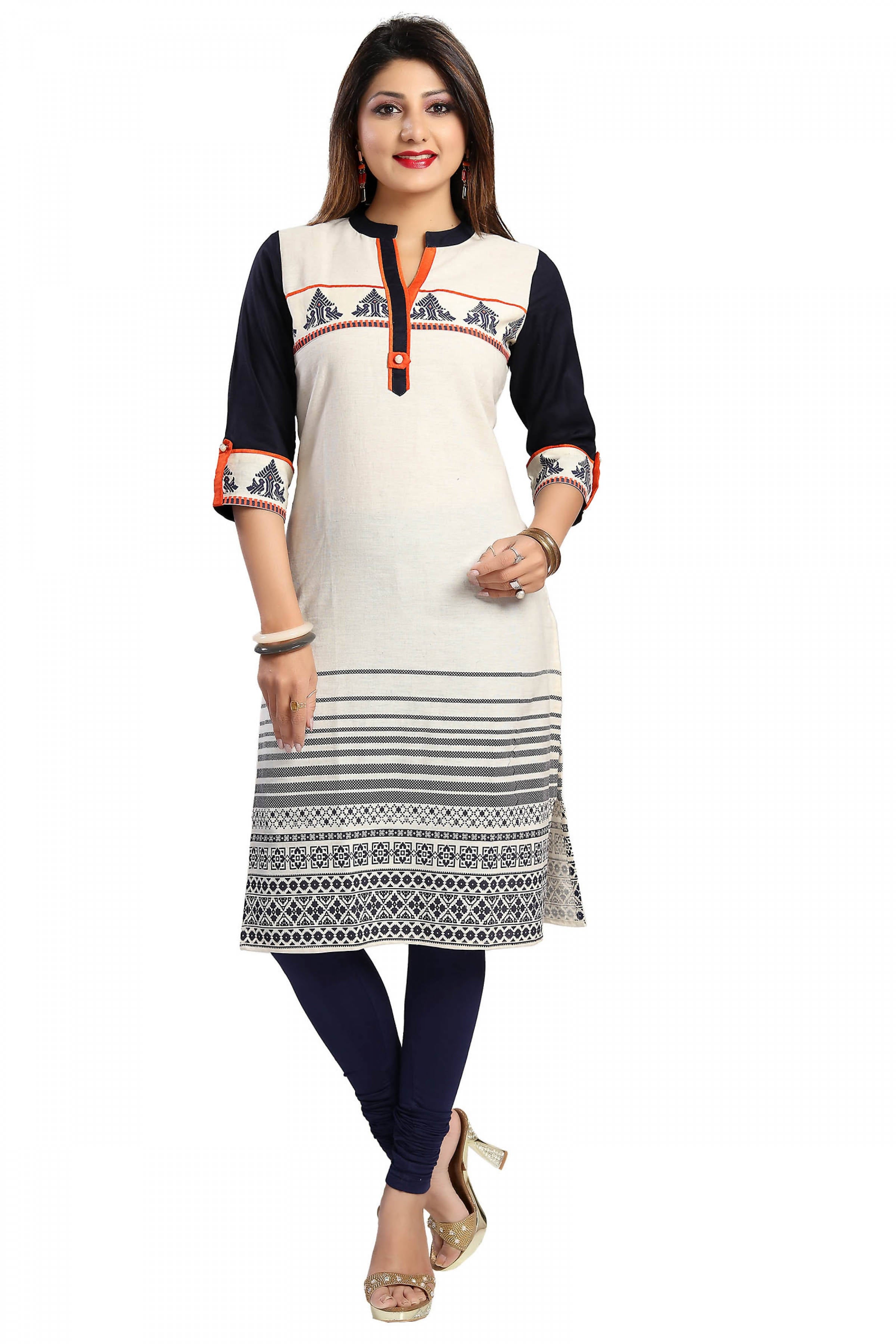 March out in full confidence of the fashion-forwardness that this desirable Curiously Contemporary Cream Cotton Tunic with Print Design from Snehal Creation brings to your humble wardrobe. This tunic has a cream body with a blue ban collar and sleeves. Faint black printing in the form of horizontal running patterns decorates the tunic in various instances, including the inside-out folds of the cuffs. The orange color provides an excellent accent at various places on the piece.
