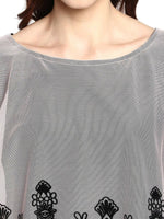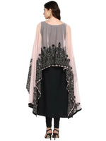 This is a black Kurta with an attached Dupatta. Kurta Made from crepe fabric & dupatta fabric is net having flock print work on it. it has a boat neck with sleeveless, Kurta Length is 51"