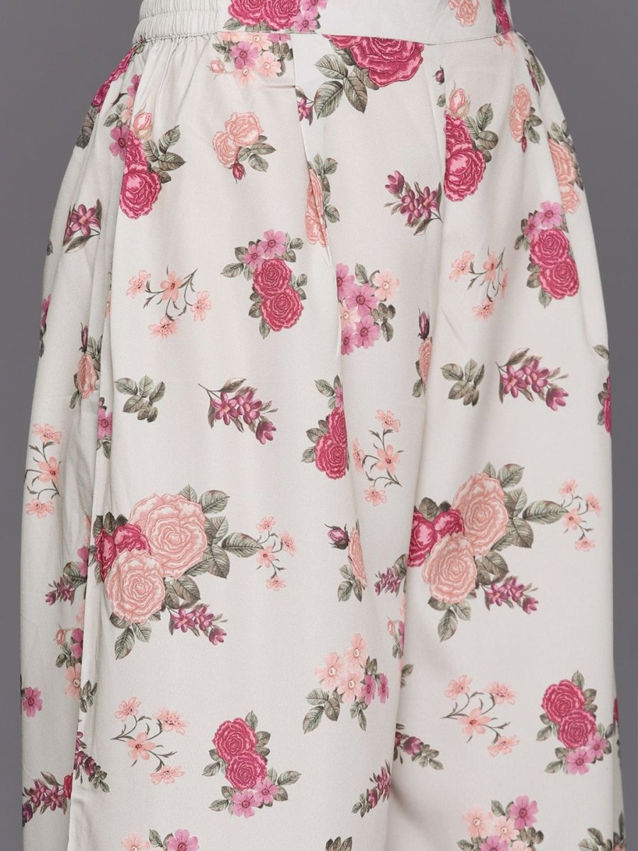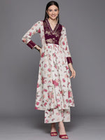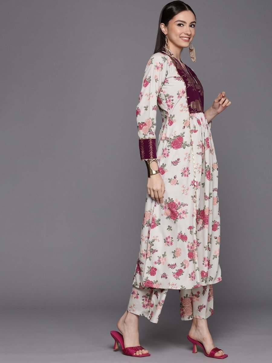 Flaunt your glam look when you step out donning this voguish Kurta palazzo set. The detailing of this kurta is digital print with floral pattern & smoke print on yoke.This kurta set boasts a lovely V neck and curved hemline, calf length, Three-Quarter Sleeves, side pocket, Elegant beige & wine colour, Kurta & Palazzo made from Crepe fabric. palazzo is Partially elastic (37" Length), Handwash.You can team it up with high heels or flat jutties with long earrings.