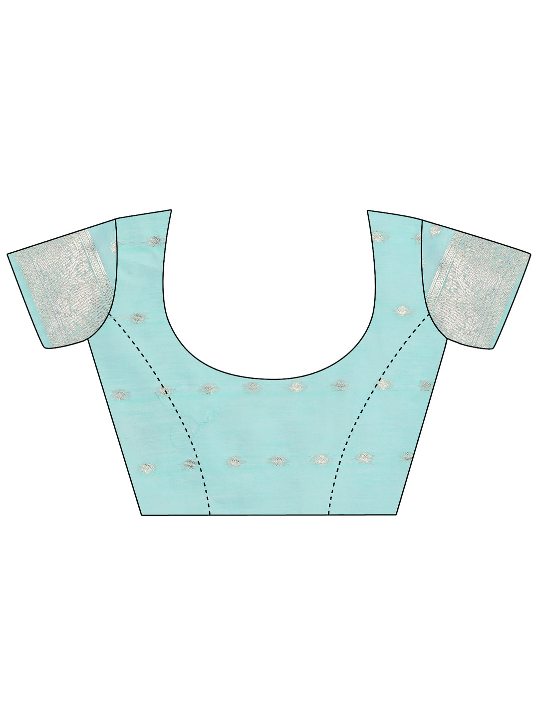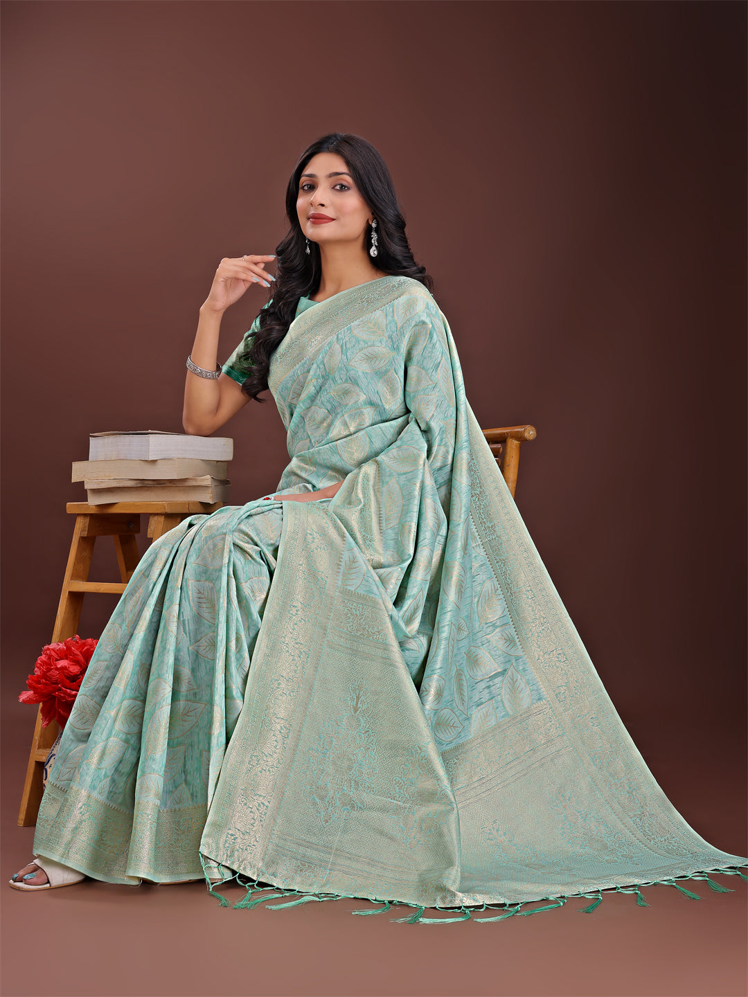 Turn heads in this stunning sea green linen saree featuring golden zari leaf motifs and an intricately woven pallu. Made from a lightweight linen cotton blend, it is perfect for daily wear, office attire, or festive gatherings. Comes with a matching unstitched blouse piece for a complete ethnic ensemble.