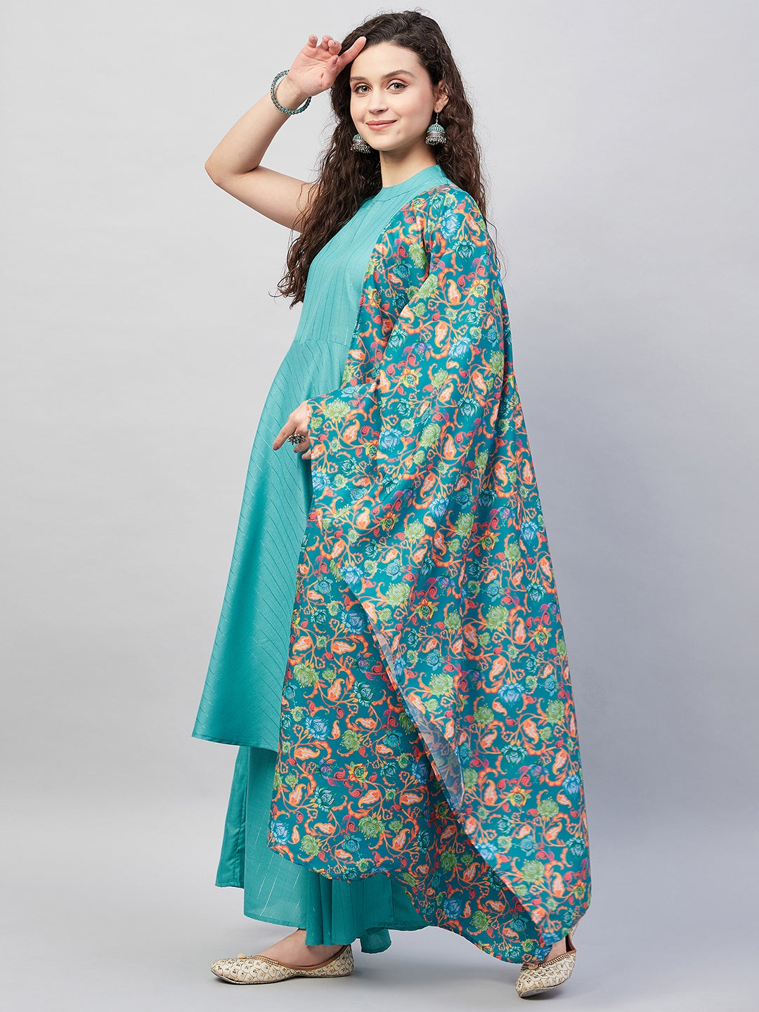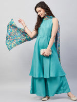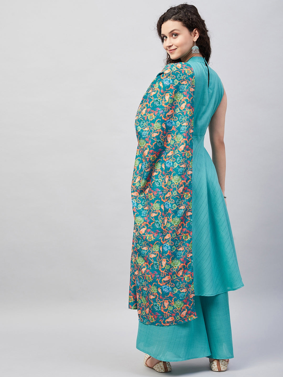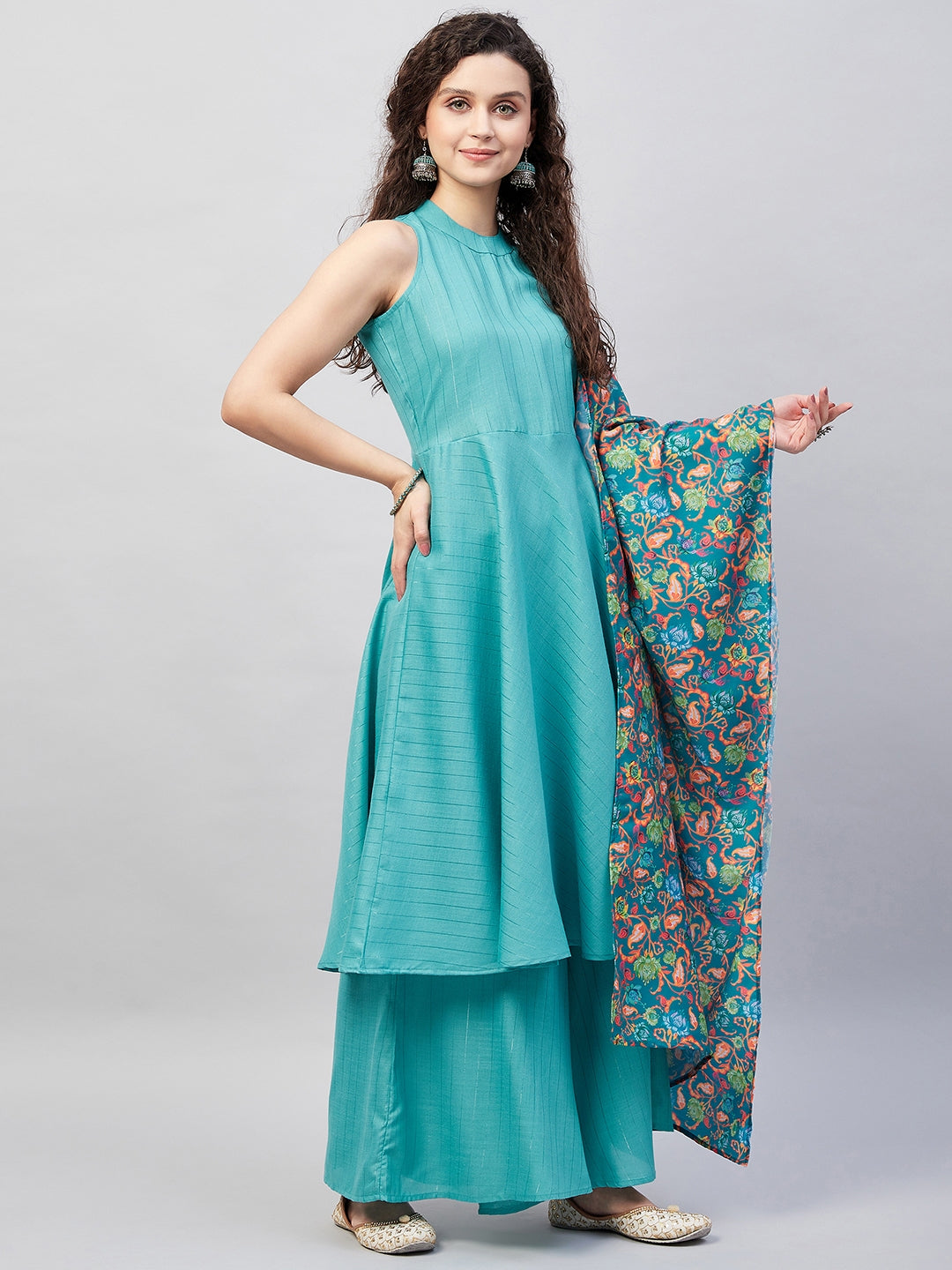 It is time to flaunt your fine choice in sartorial pieces with this teal lurex kurta set with dupatta. Hand Wash Separately.