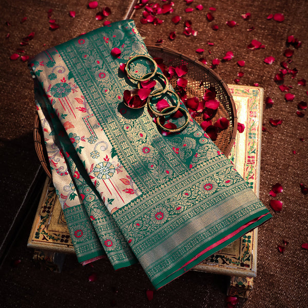 A ceremonial Dharmawaram saree in 6.5 meters cut, detailed with Nylon zari that exudes tradition and class.