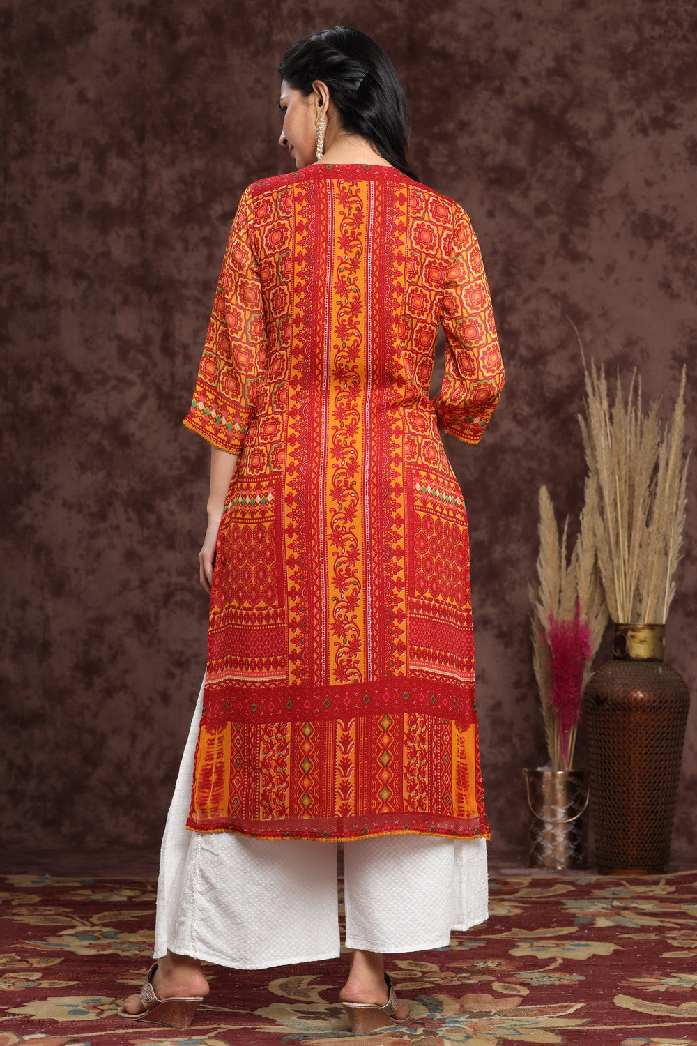 Juniper Women's Mustard Chiffon Printed Straight Kurta