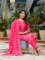 Juniper Women's Pink Ethnic Motif Printed Liva Rayon Kurta Pant And Dupatta Set With Beads Sequins & LacePink Ethnic Motif Printed Liva Rayon K...