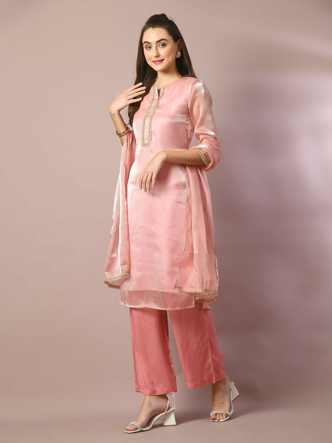 Myshka Women's Pink Solid Straight Party Kurta Set With Dupatta