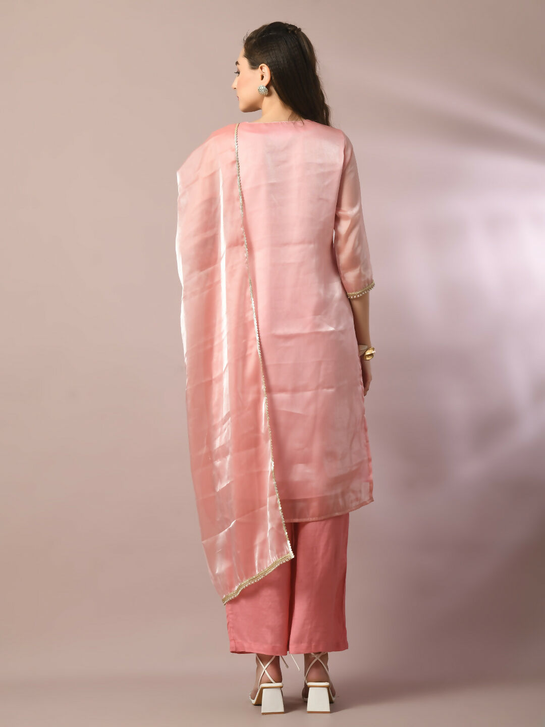 Myshka Women's Pink Solid Straight Party Kurta Set With Dupatta Color: Pink Top Type: Kurta Bottom Type: Palazzos Dupatta: Yes Dupatta Fabric...