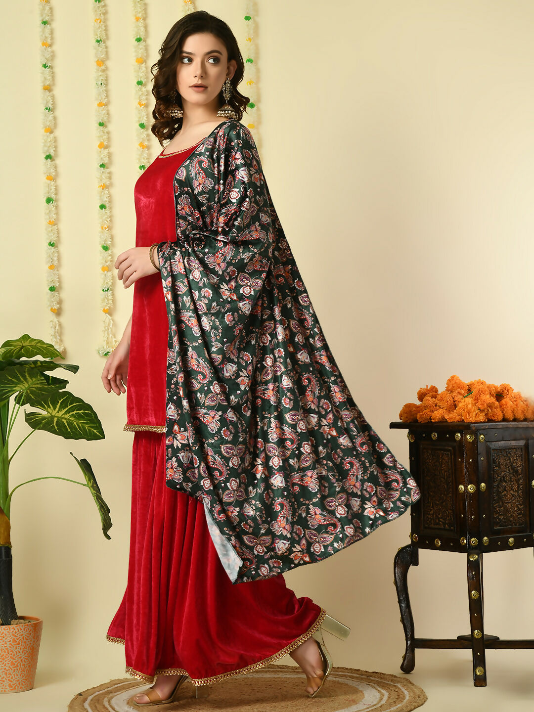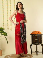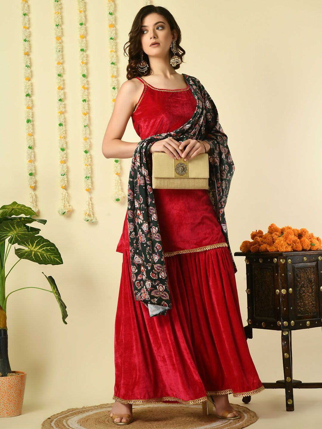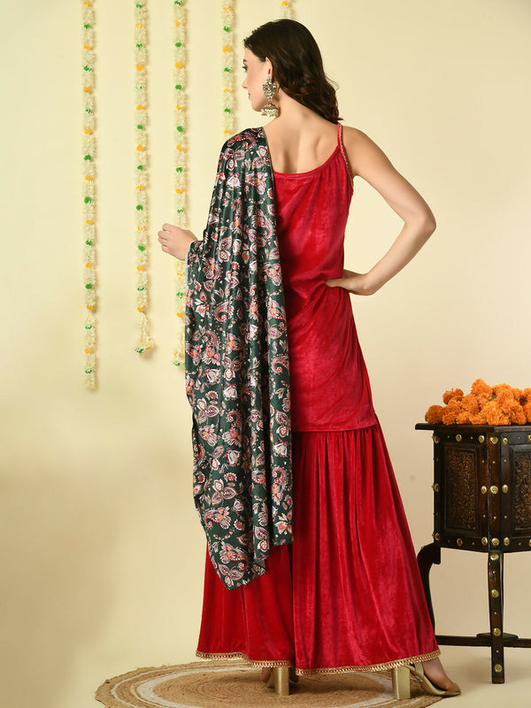 Myshka Women's Pink Velvet Kurti & Sharara With Dupatta Party Sets - S