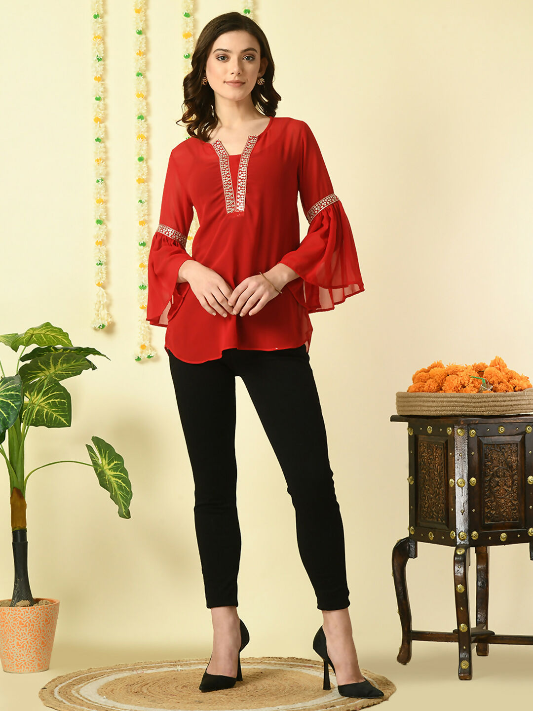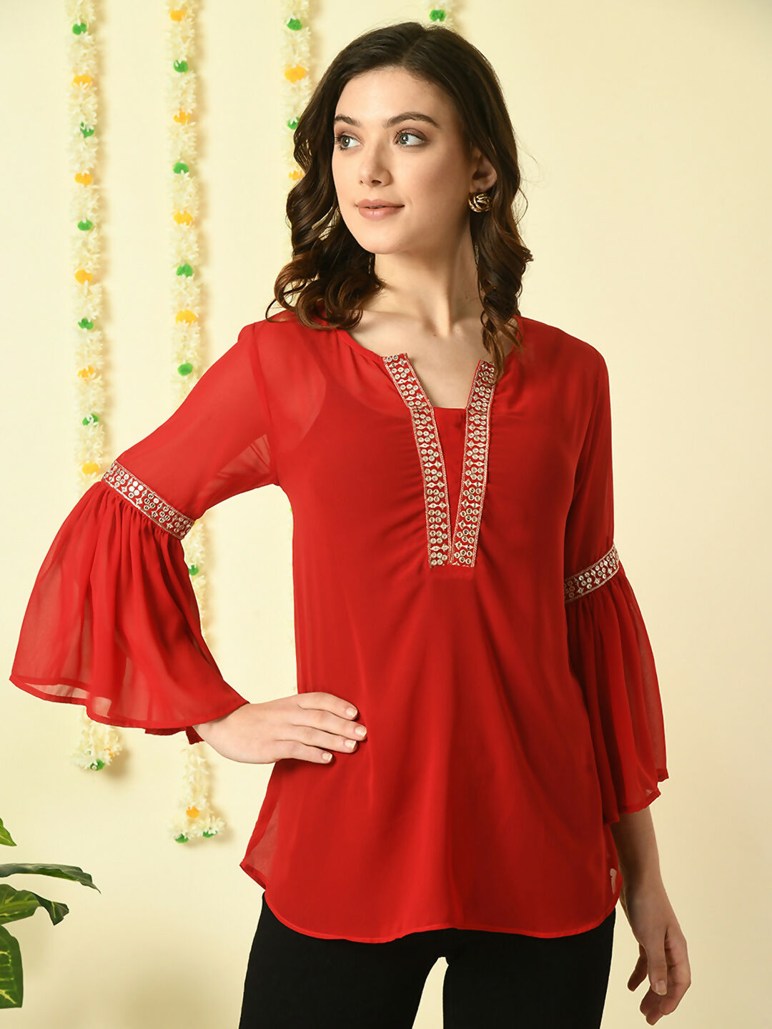 Myshka Women's Red Embroidered Party Fusion Top Color: Red Top Type: Top Bottom Type: NA Dupatta: NA Dupatta Fabric: NA Fabric: Georgette L...