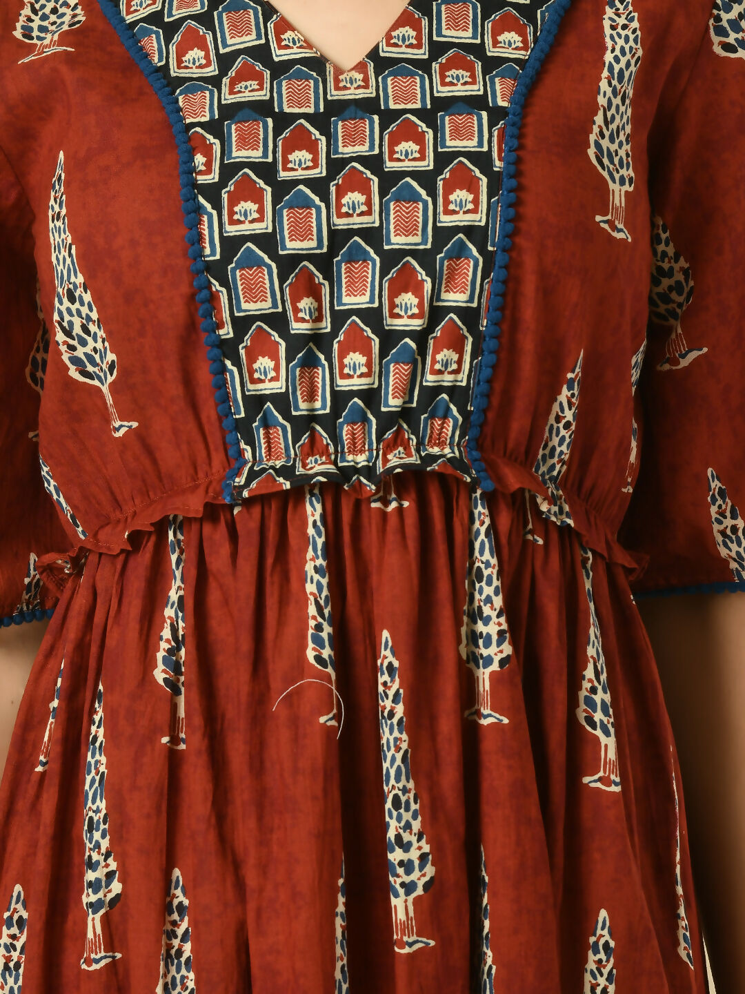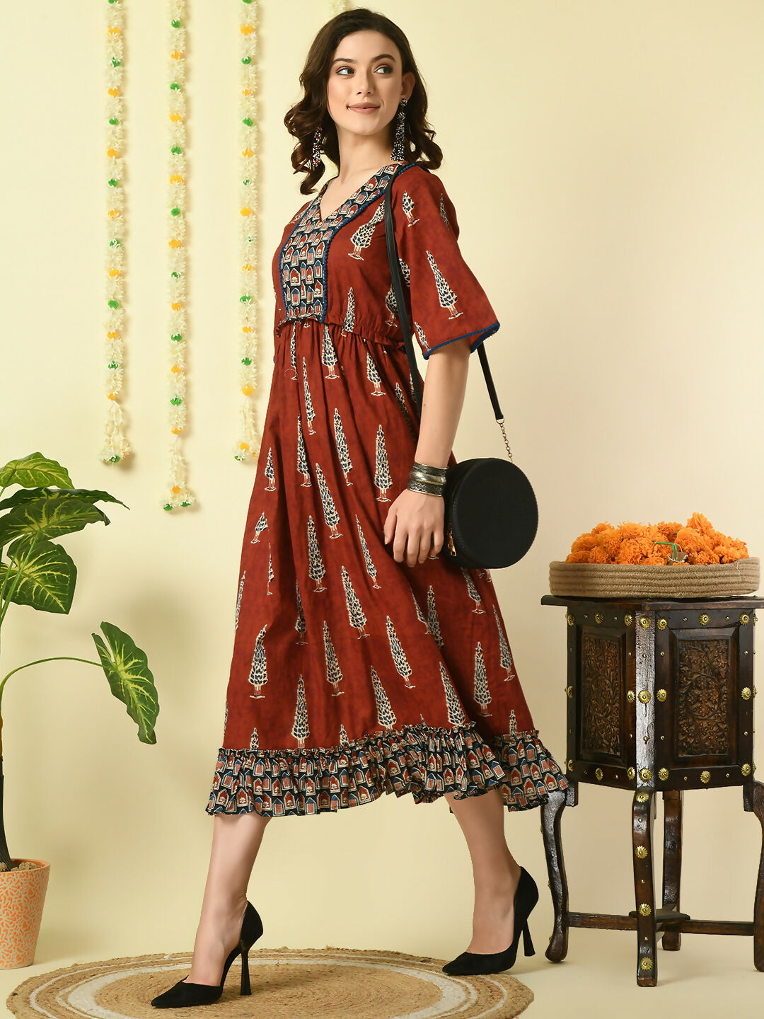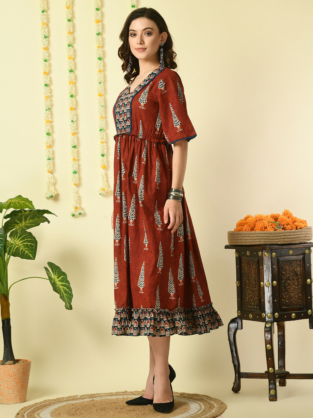 Myshka Women's Rust Printed Cotton Party Dress Color: Rust Bottom Type: NA Dupatta: NA Dupatta Fabric: NA Fabric: Cotton Lining: NA Pattern...