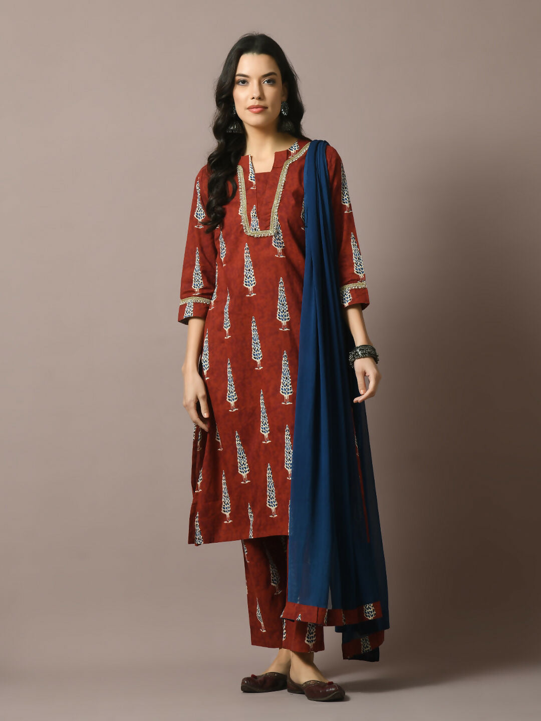 Myshka Women's Rust Printed Cotton Straight Party Kurta Set With Dupatta Color: Rust Top Type: Kurta Bottom Type: Trousers Dupatta: Yes Dupat...