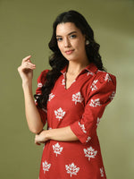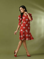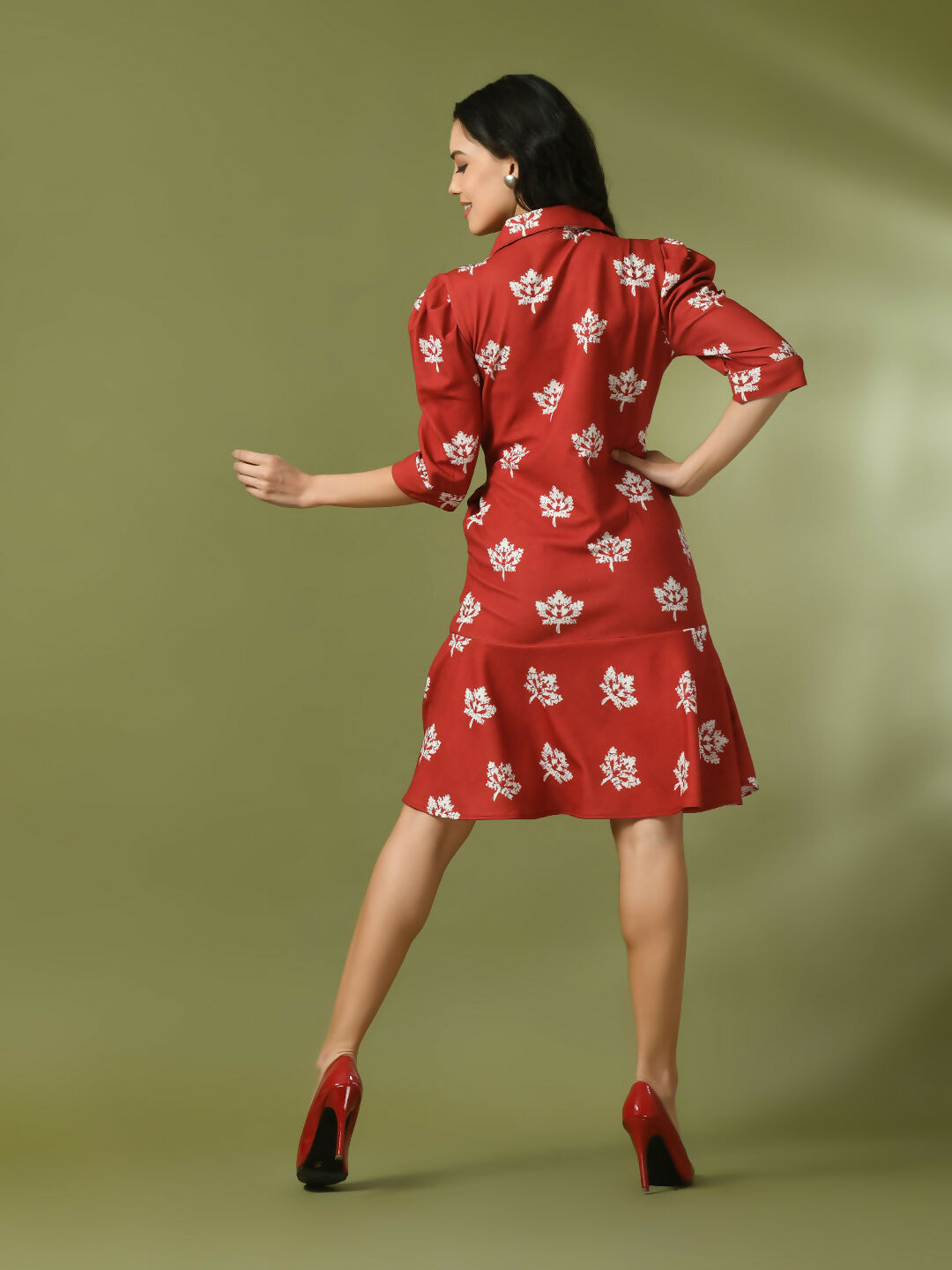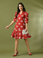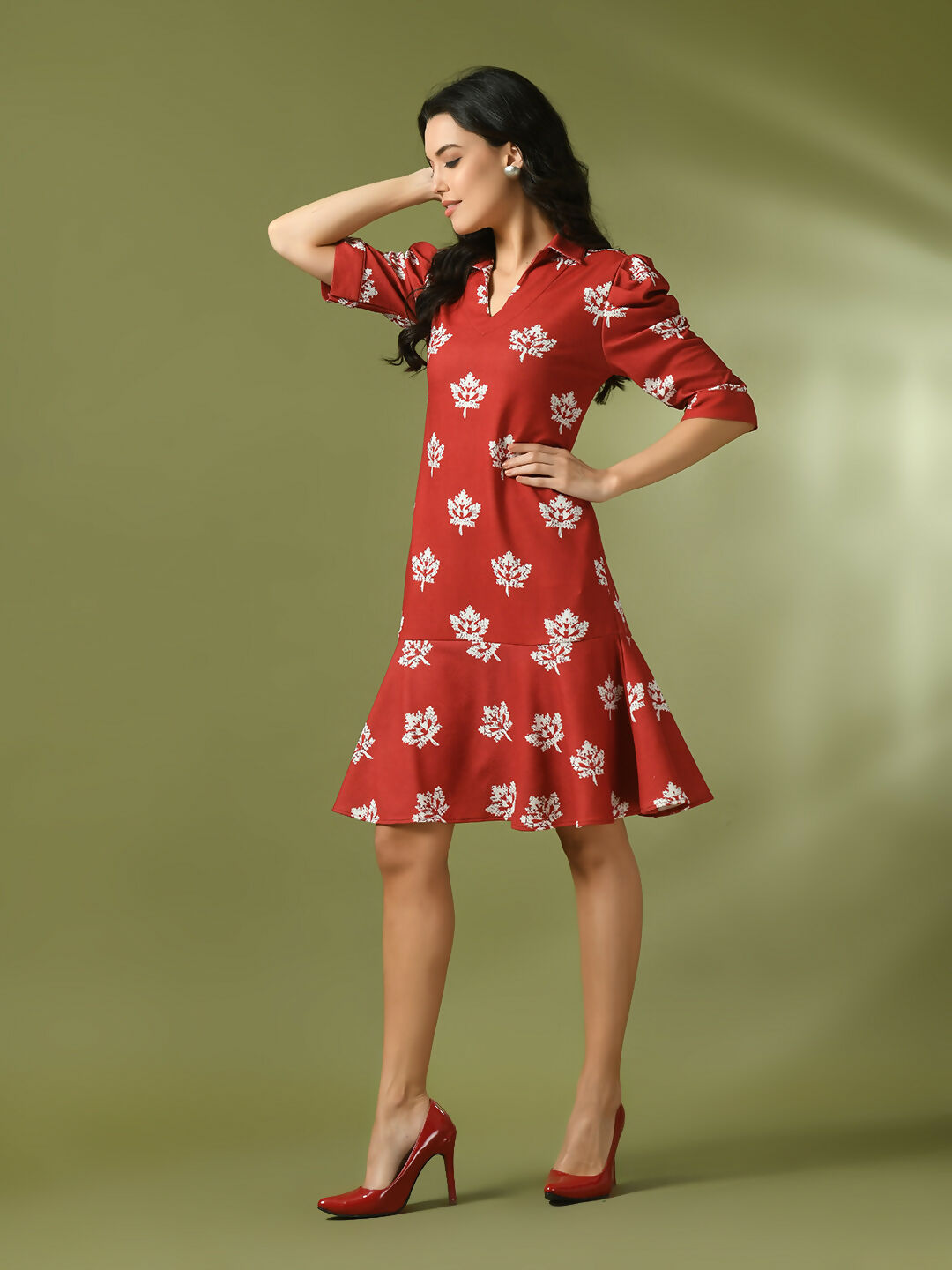Myshka Women's Rust Printed Shirt Collar Fit and Flare Party Dress - S