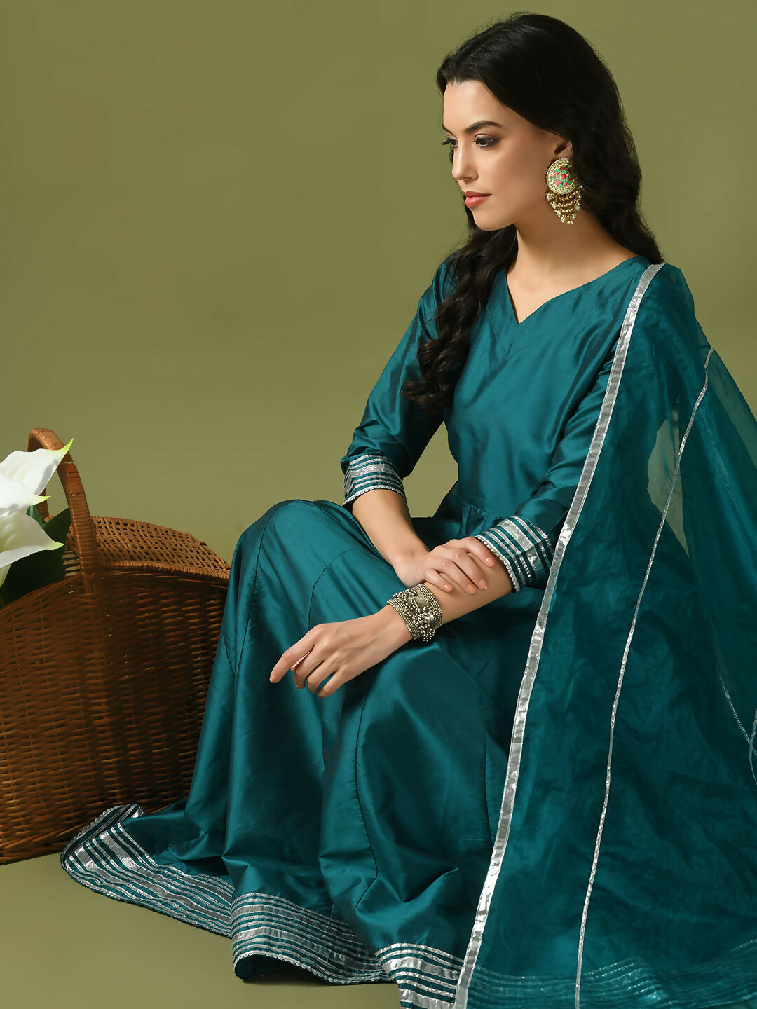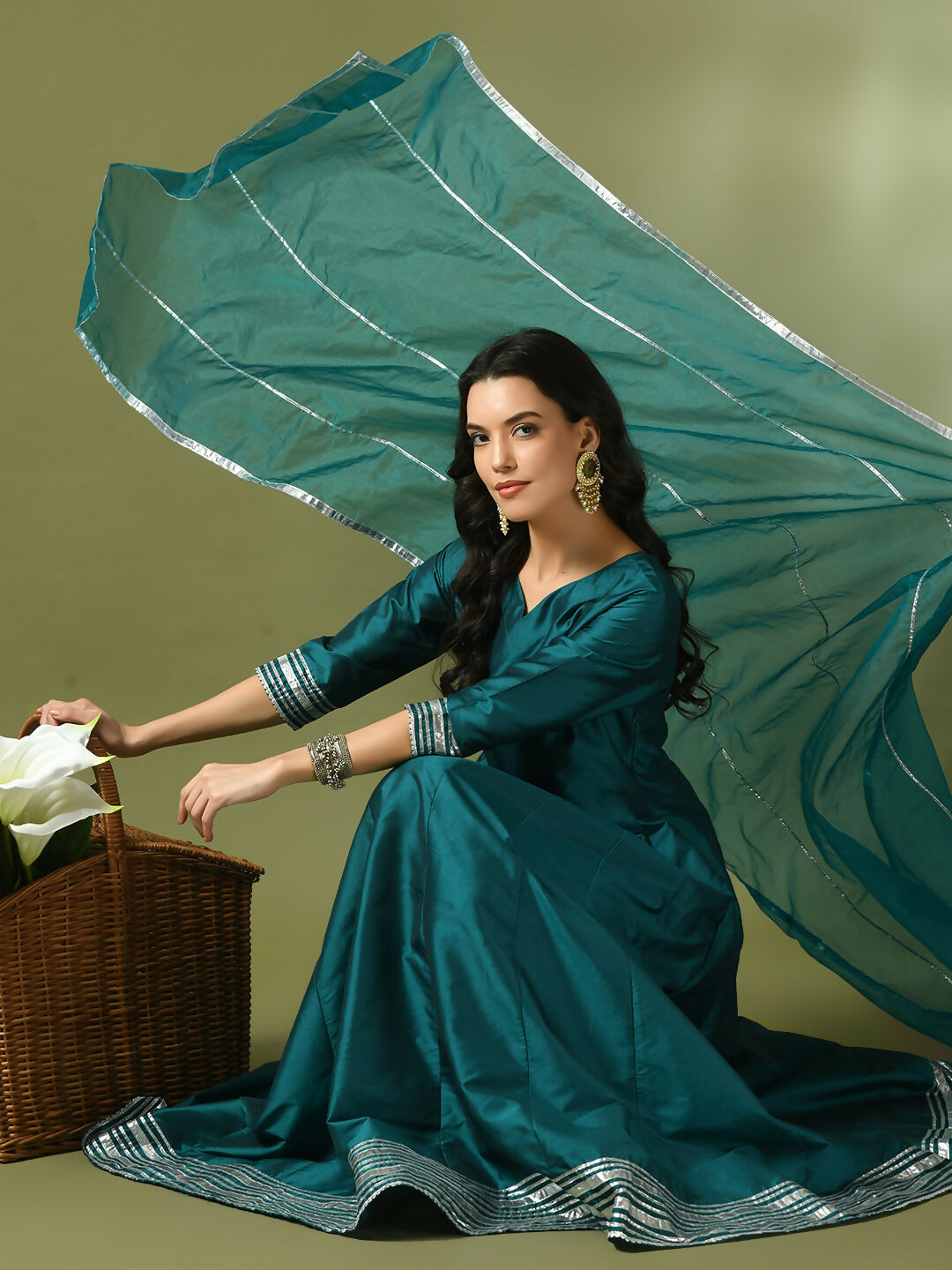 Myshka Women's Teal Solid Silk Anarkali Party Kurta With Dupatta Color: Teal Top Type: Kurta Bottom Type: Na Dupatta: Yes Dupatta Fabric: Org...