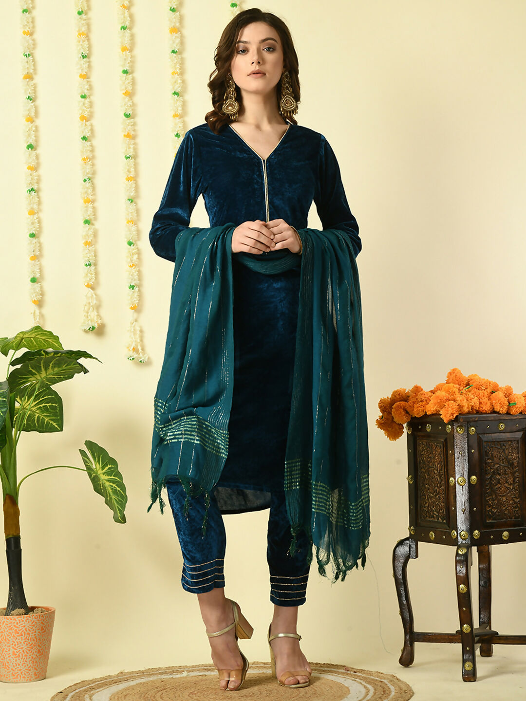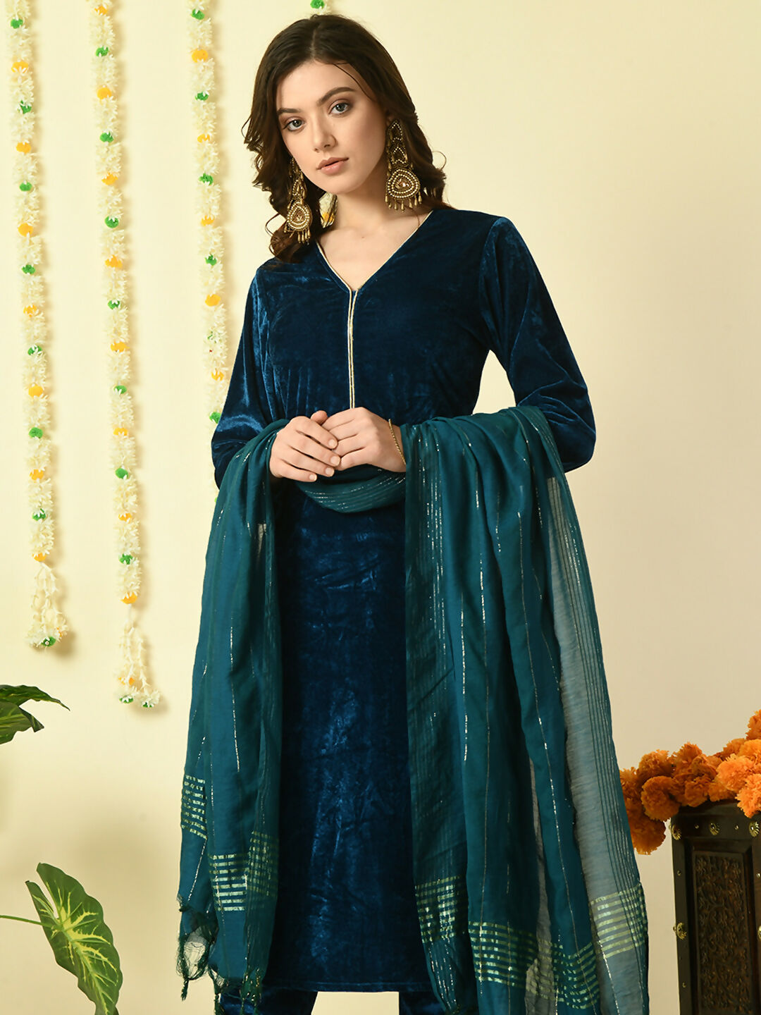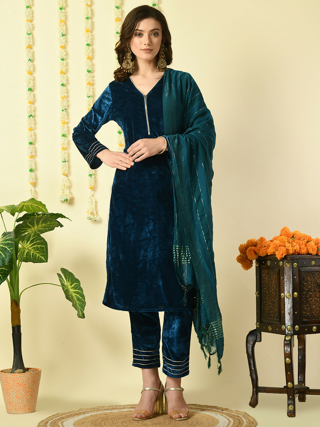 Myshka Women's Teal Velvet Kurta & Trousers With Dupatta Party Sets Color: Teal Top Type: Kurta Bottom Type: Trousers Dupatta: yes Dupatt...