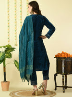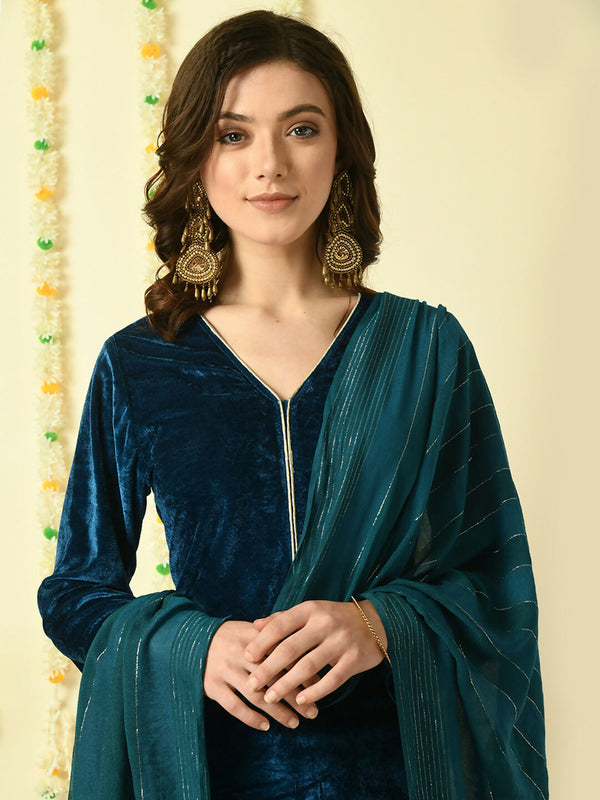 Myshka Women's Teal Velvet Kurta & Trousers With Dupatta Party Sets