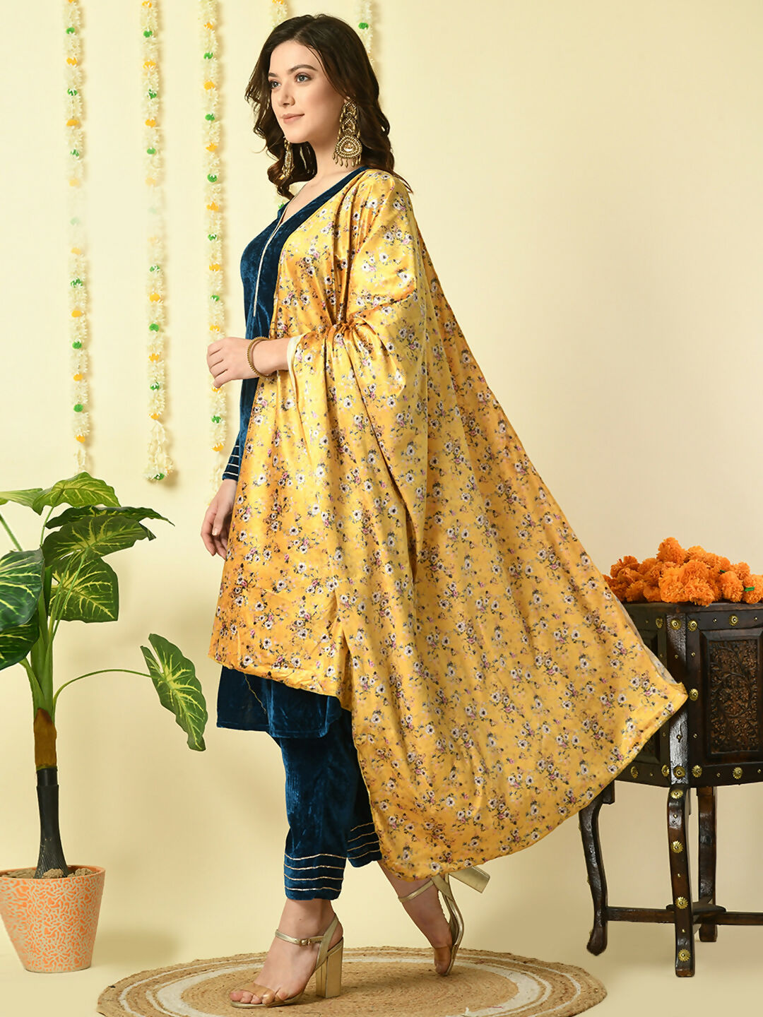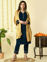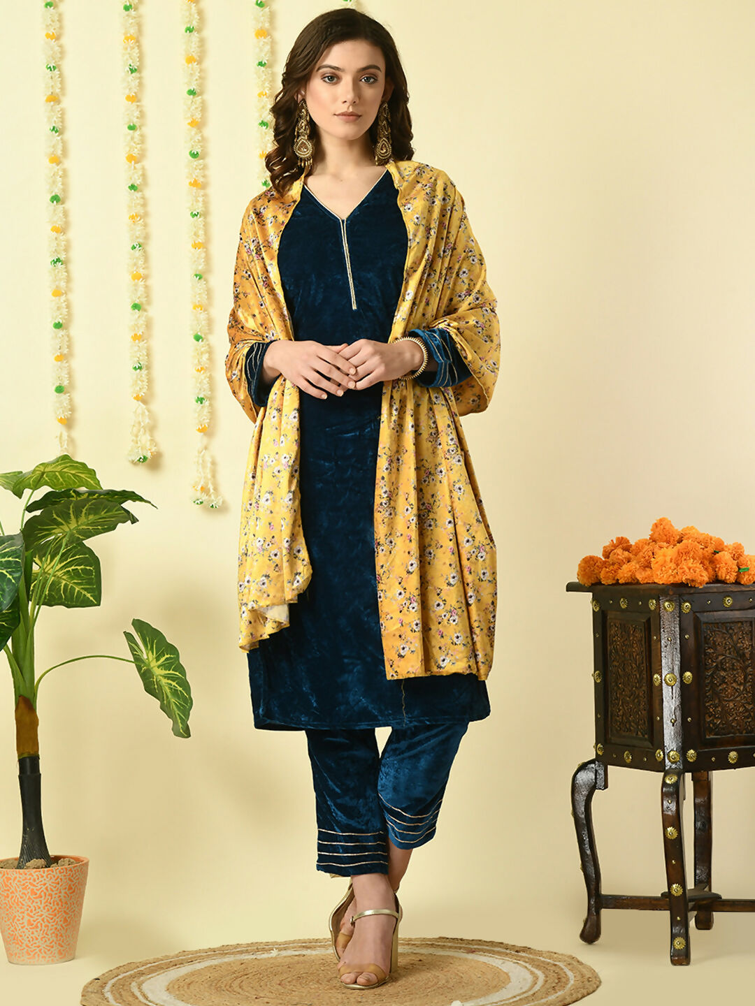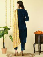 Myshka Women's Teal Velvet Kurta & Trousers With Dupatta Party Sets