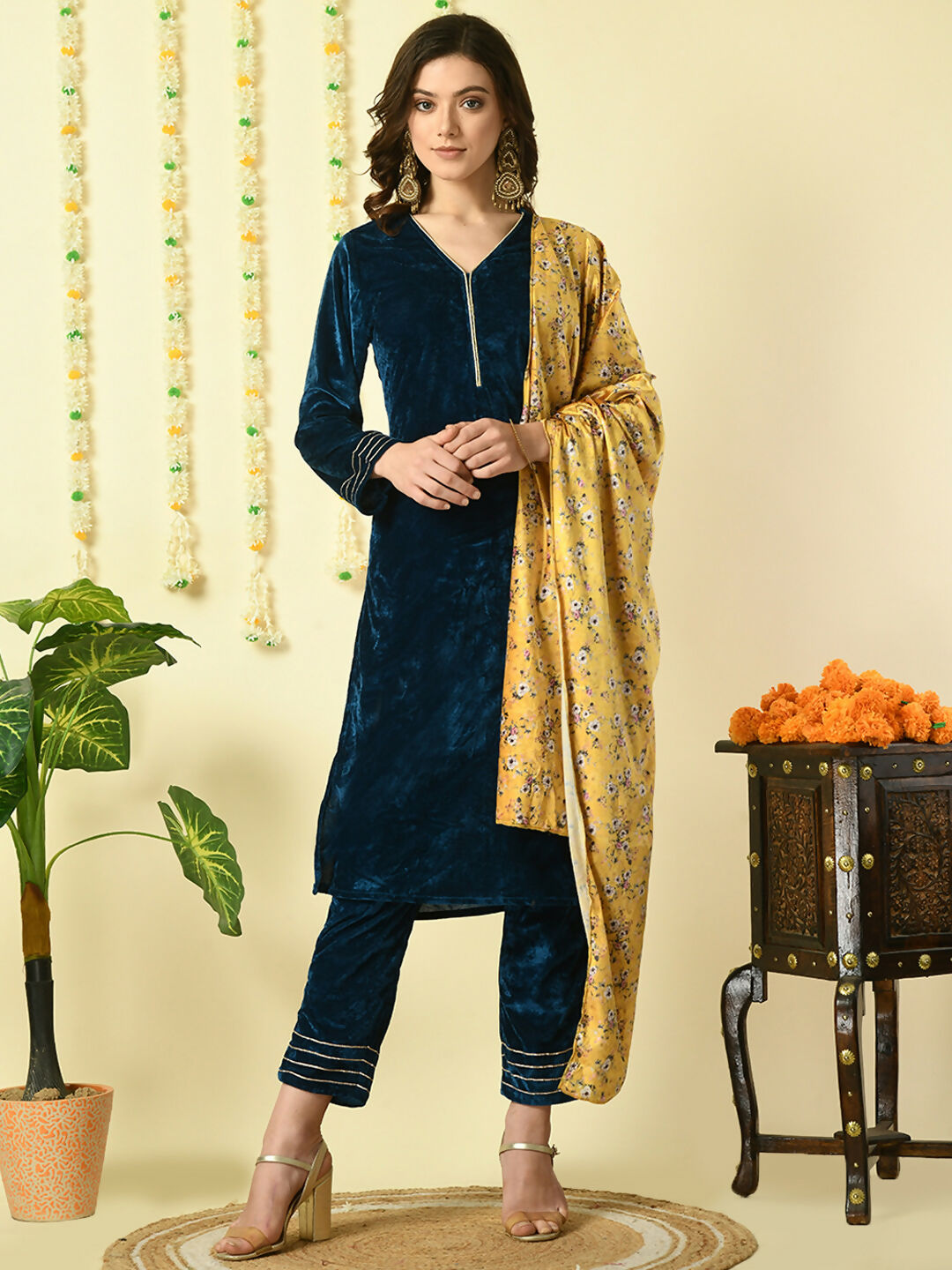 Myshka Women's Teal Velvet Kurta & Trousers With Dupatta Party Sets Color: Teal Top Type: Kurta Bottom Type: Trousers Dupatta: yes Dupatt...