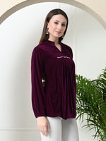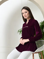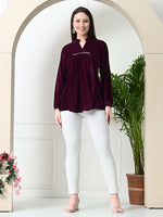 Myshka Women's Velvet A-Line Collared Neck Party Tunic In Wine Colour Pack Contains: 1 top Top Length of Kurta: 28 Inch Top Shape: Relaxed Top...