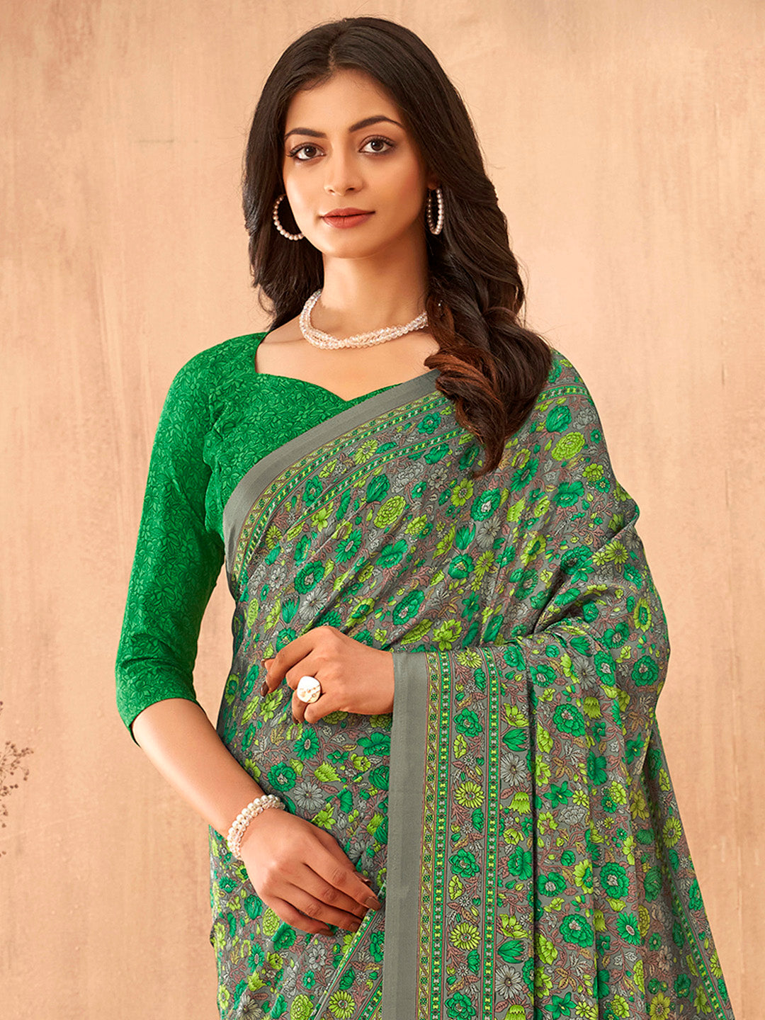 NOZ2TOZ Women's Crepe Green Printed Designer Saree With Blouse PieceDESCRIPTION This saree is made from Crepe and is Grey in color. Our Ethnic Sare...