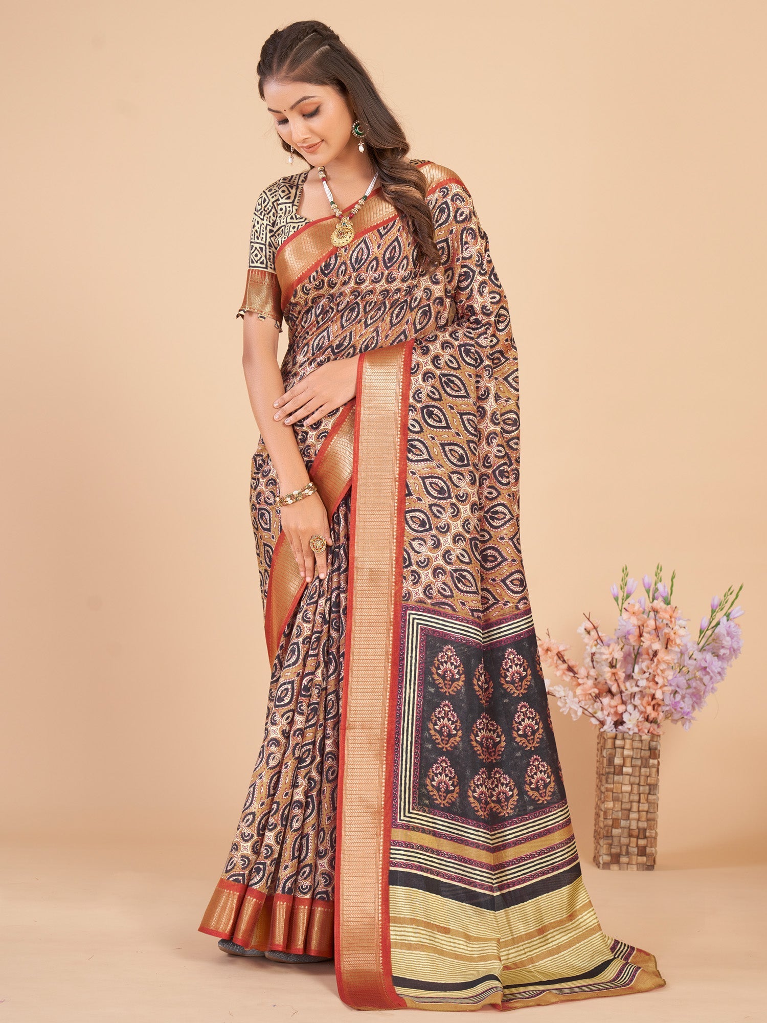 This saree is made from Dola Silk and is Beige in color. Our Ethnic Sarees comes With Blouse Piece, Which can be Stitched according to Your Taste and Preference. This Saree is Crafted by Skill Craftsmen without Compromising on its Quality. With This Beautiful Design and Fabric, This Saree will fetch You Oodles of Compliments and Praise. saree fit size is 5.5 mtr saree & 0.8 mtr Blouse, Free Size |.