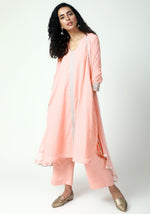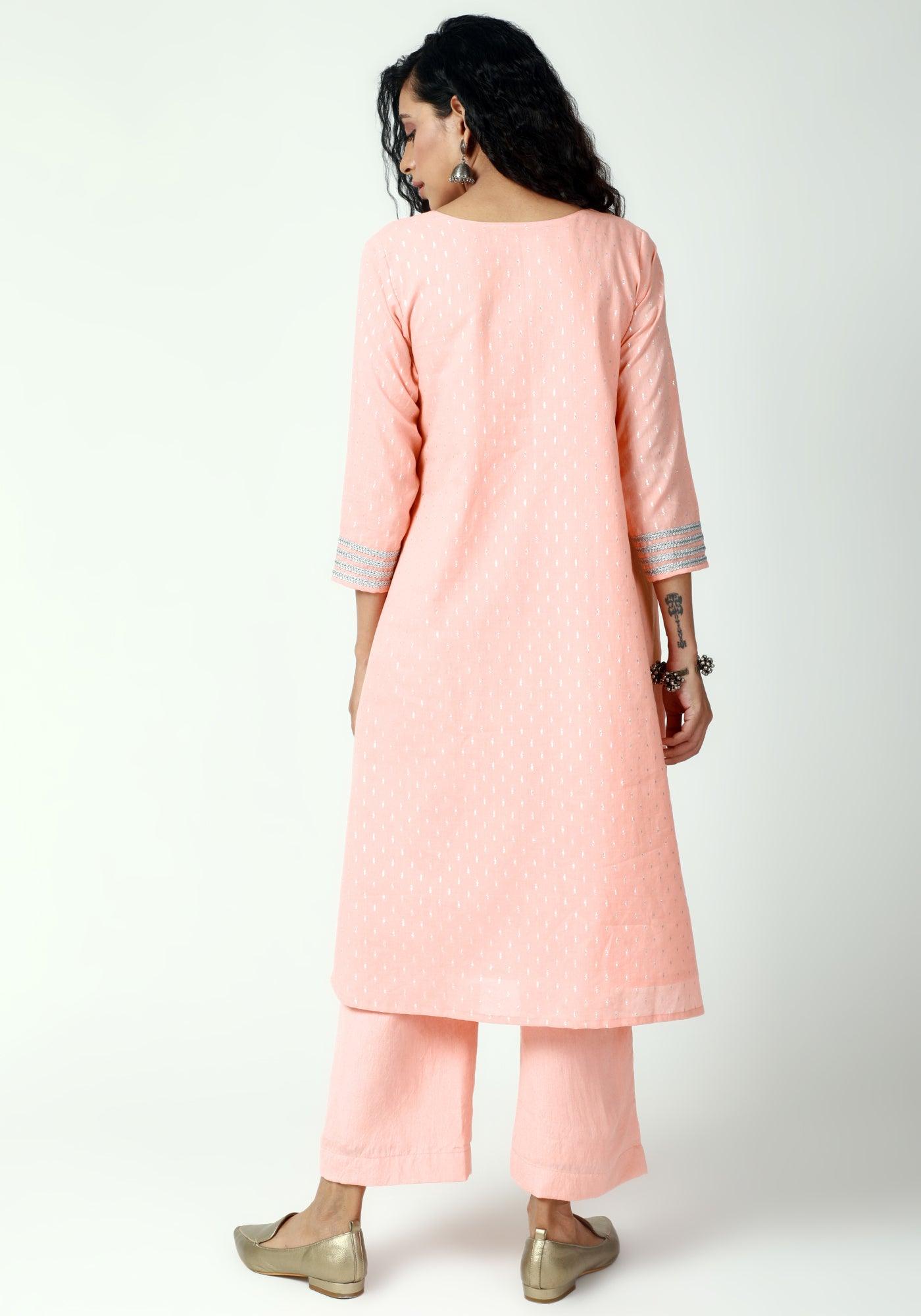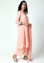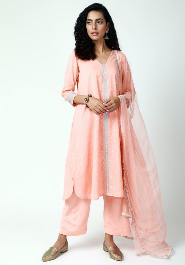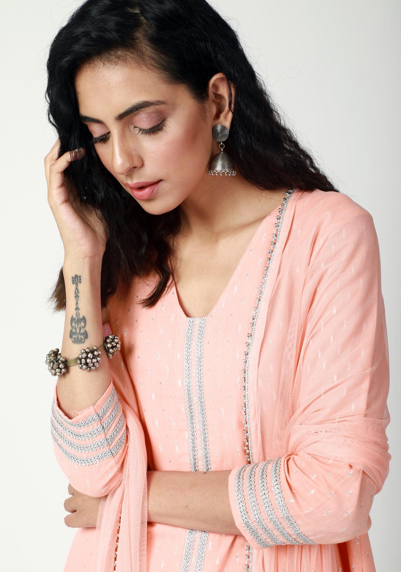 trueBrowns Peach Silver Laced Kurta-Pant-Dupatta - 2XS