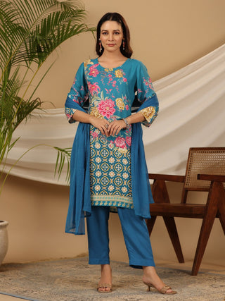 Juniper Blue Floral Printed Rayon Kurta Pants & Dupatta Set With Sequins Work
