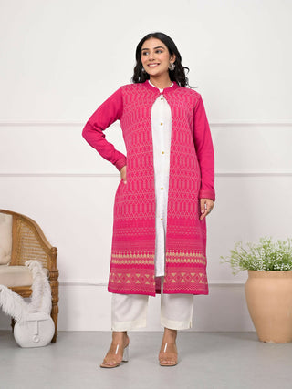 Juniper Women's Pink Ethnic Motif Printed Cotton Kurta & Shrug With Doris