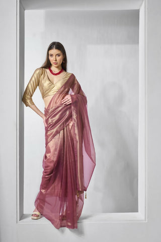 Onion Gold Tissue Net Solid & Gold Cotted Saree - Samaa