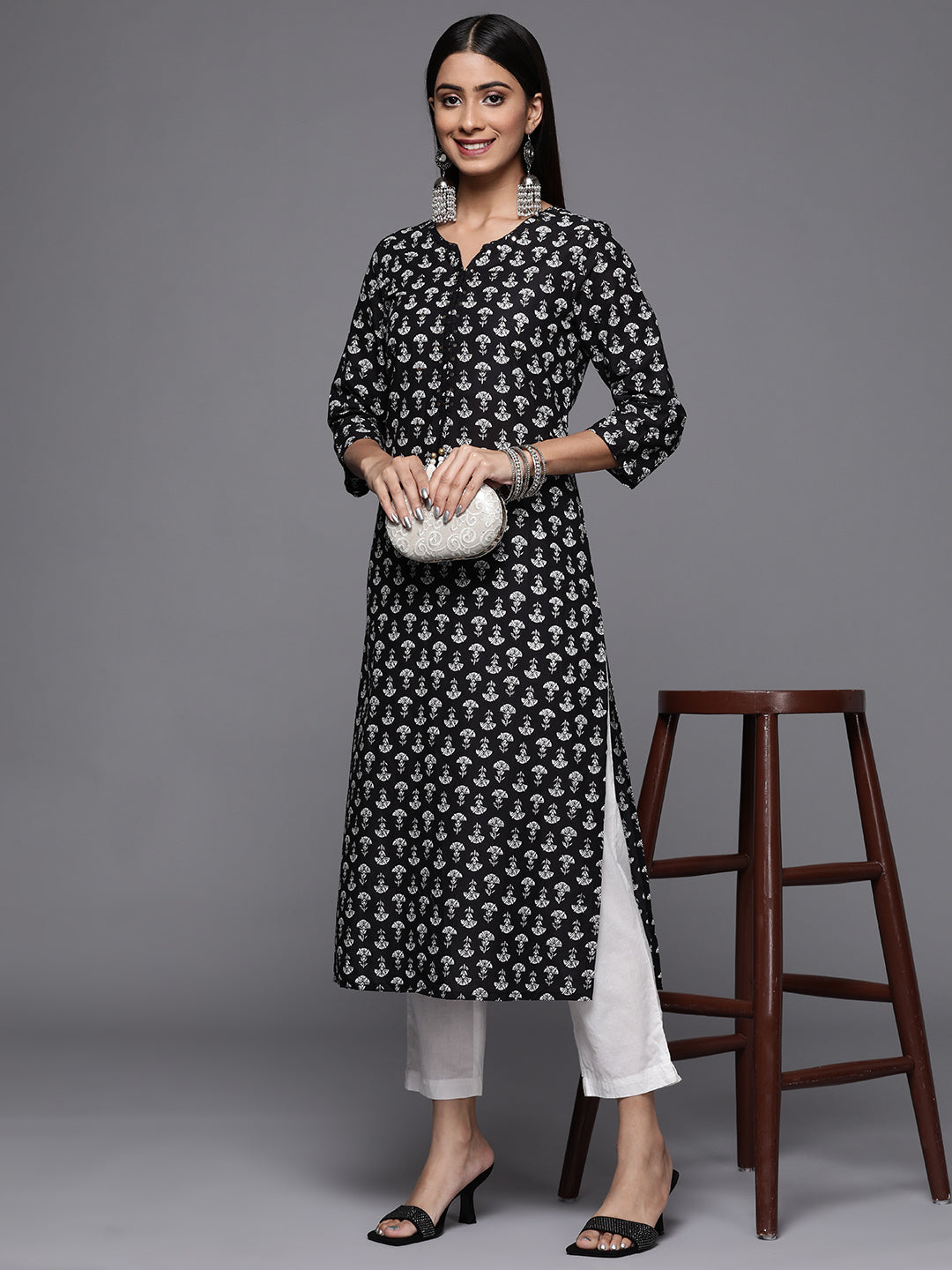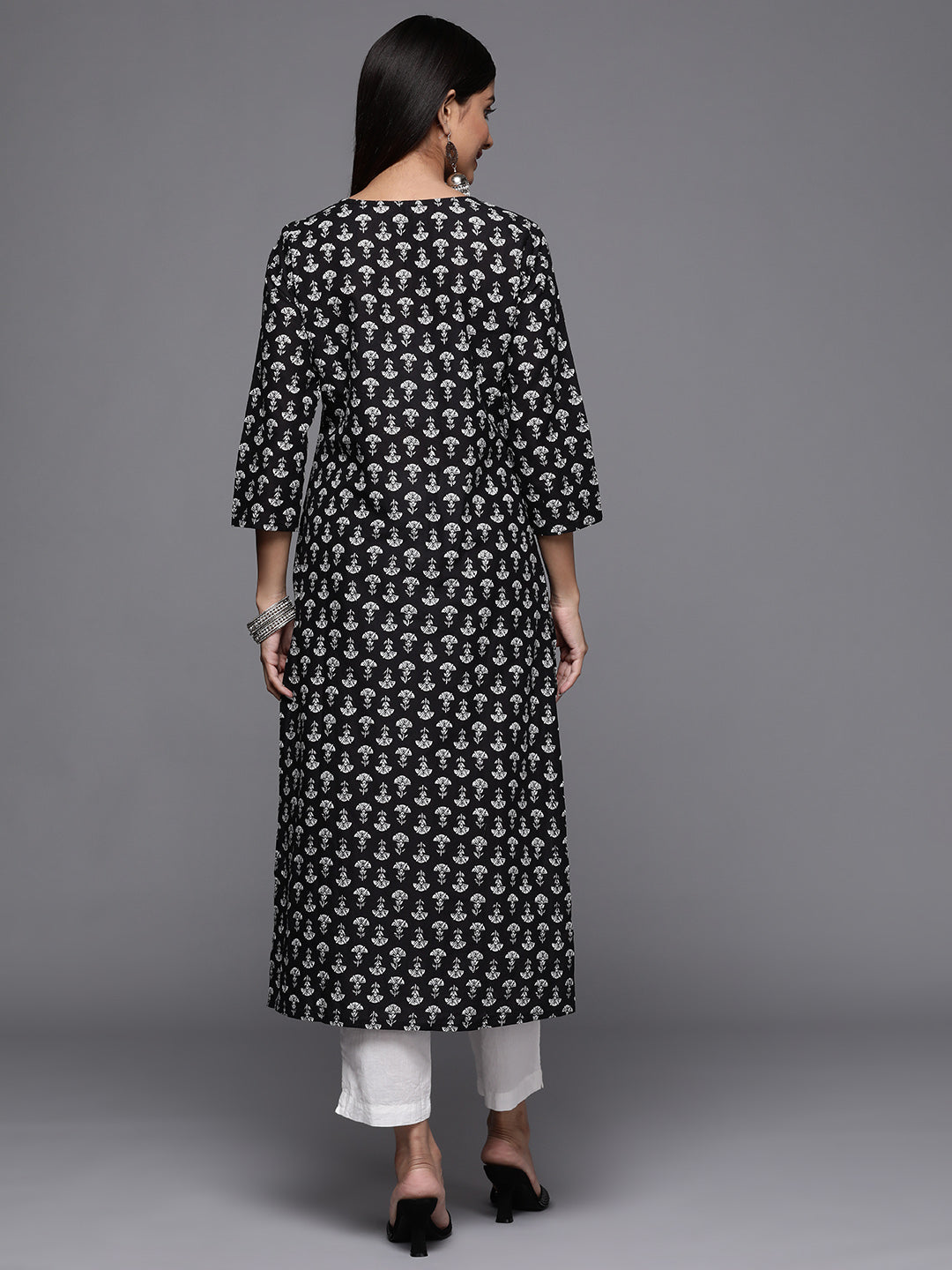 Black flower printed embroidered kurta has round neck and three quarter sleeves, straight kurta with side slits.