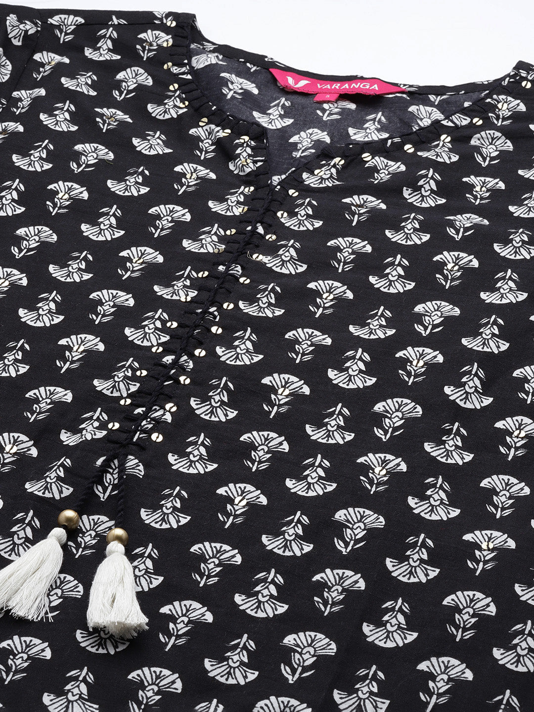 Varanga Black Printed Kurta With Hand Work Detailings About the product: Black flower printed embroidered kurta has round neck and three quarter s...