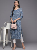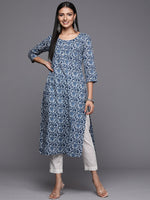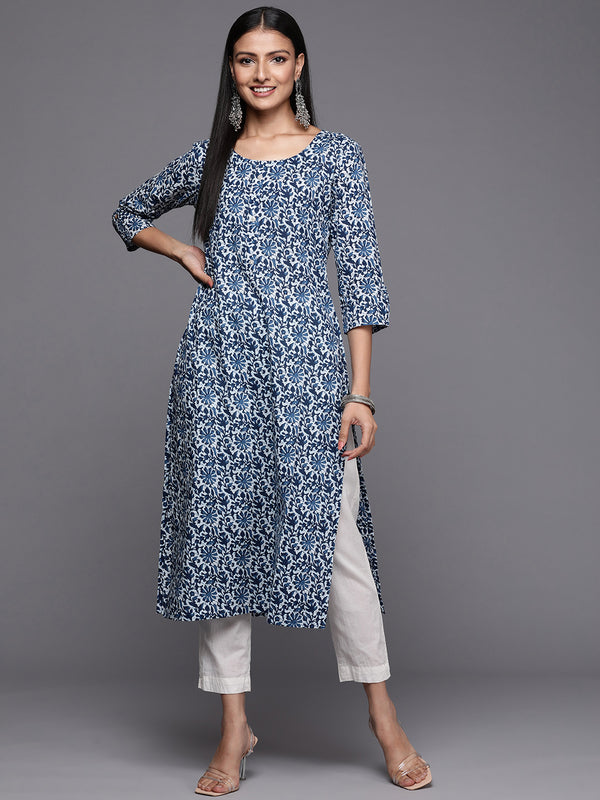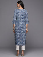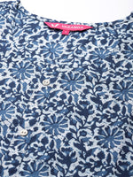 Blue printed kurta with round neck, kurta has three quarter sleeves, button detailings on placket.