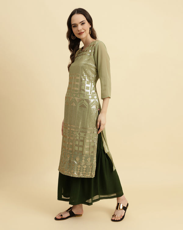 Varanga Green Sequened Kurta With Sharara And Sequened Ombre Dupattasequened embroidered kurta with contrast sharara and ombre duapatta, round neck...