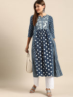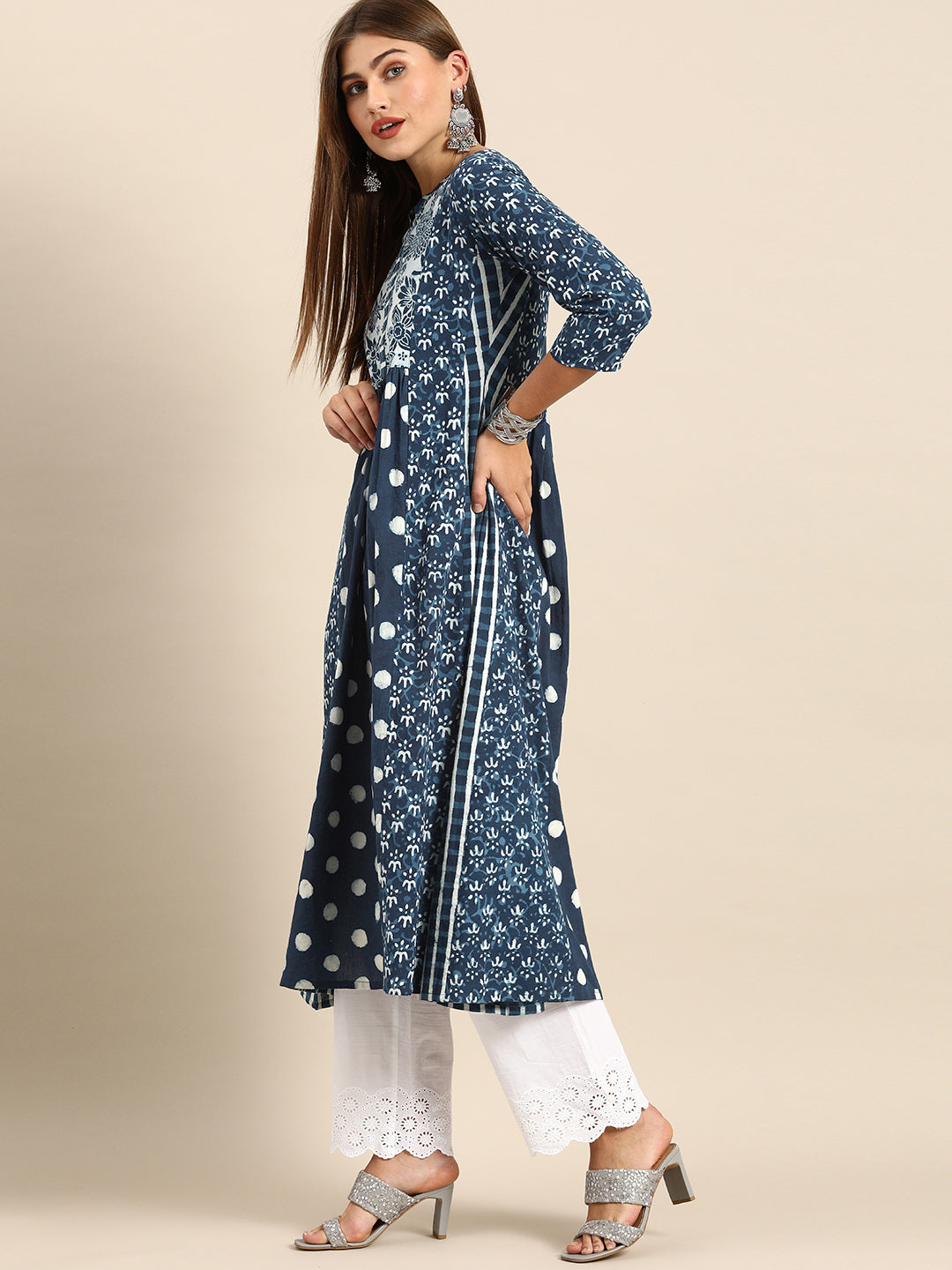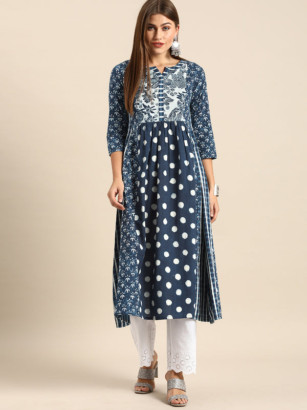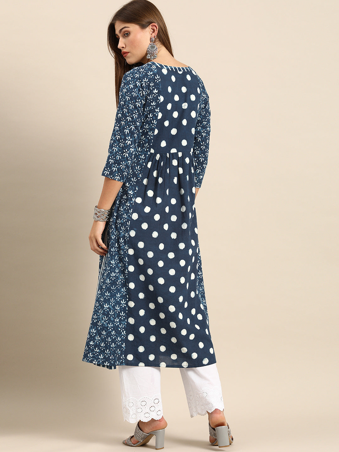 Varanga Mix And Match Navy Blue And White Printed Paneled Kurta With Round Neckline And 3/4Th SleevesAbout the product: Navy blue printed paneled k...