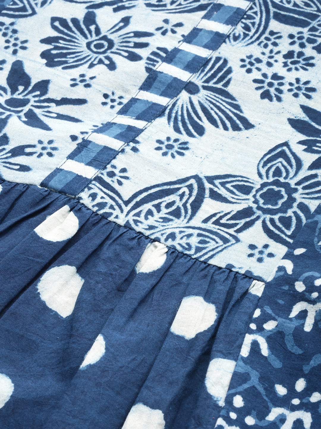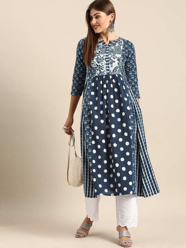 Navy blue printed paneled kurta with round neckline, mix and match prints, flared style, 3/4th sleeves.