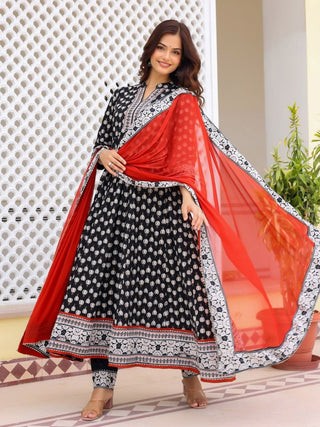 Anouk Black Ethnic Motifs Printed Mandarin Collar Anarkali Kurta With Trousers & Dupatta