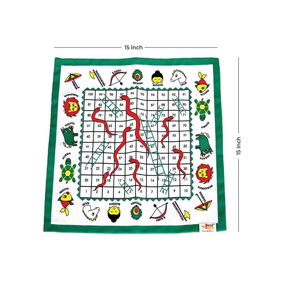 • Dimensions & Content: 1 Canvas Fabric Snakes & Ladders Board, 15 × 15 Inches, Along With A Guidebook Containing The Game's Instruction & 10 Mythological Stories Of Dashavatar